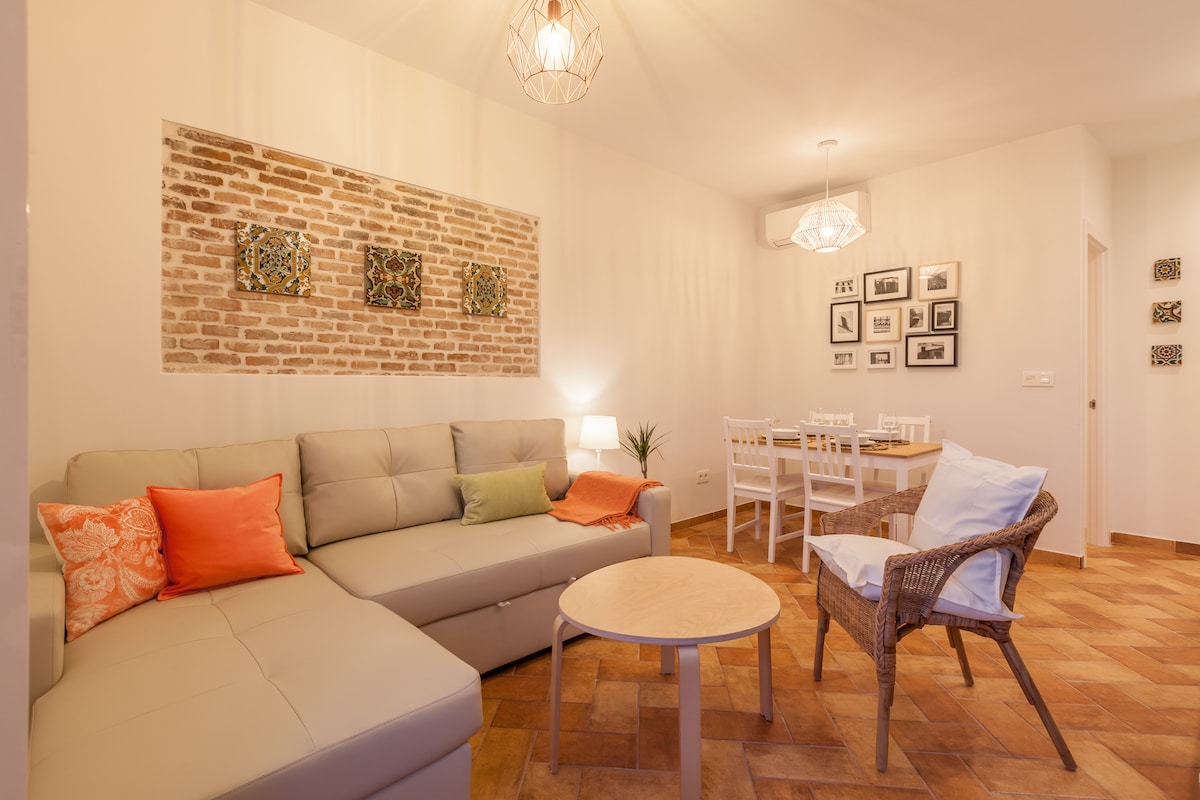 Apartamento exclusivo, estupenda ubicación en el barrio de Triana, que permite visitar zonas de interés turístico a pie,a 5 min Torre del Oro, y a sólo 10 minutos del centro histórico. Próximo a dos parking, bus,metro y supermercados. En 2 planta, de un edificio con sólo un apartamento por planta,luminoso,cálido y lleno de detalles que harán la estancia más grata y confortable.Cumpliendo con los requisitos de limpieza y desinfección. Obras públicas en la calle, puede haber ruidos durante el día.
