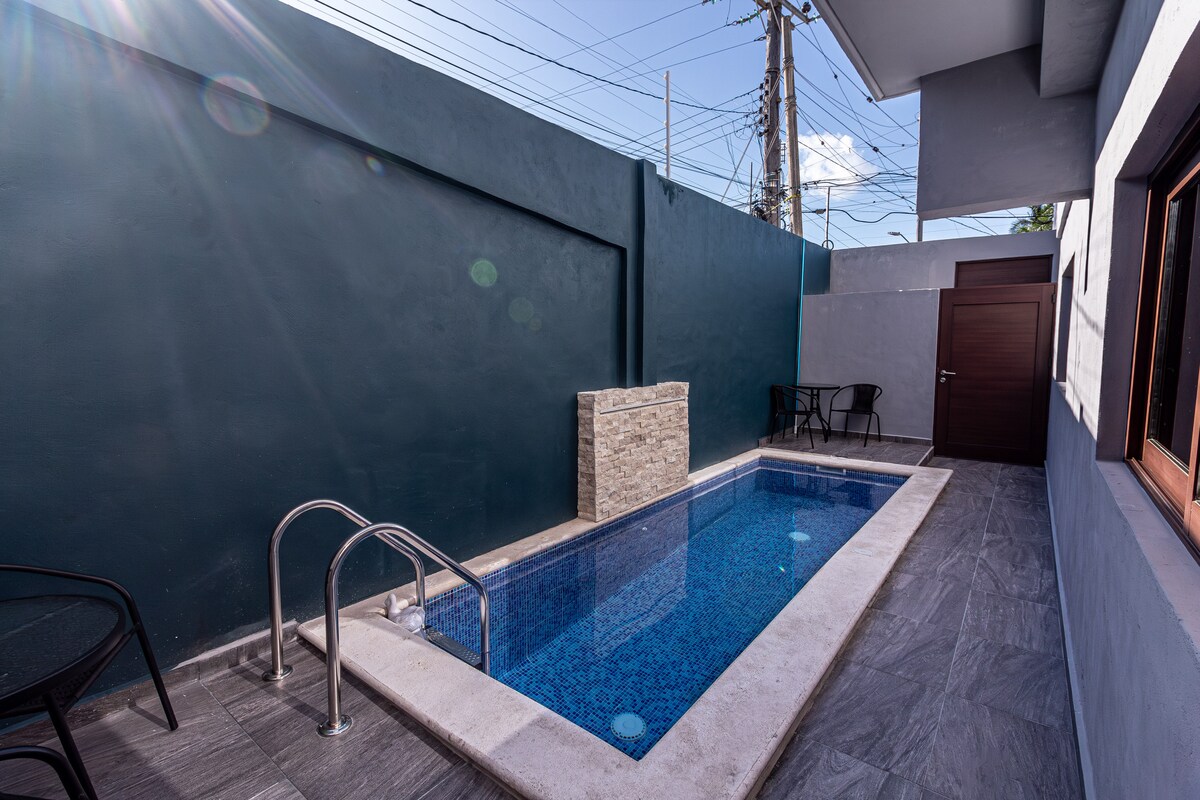 Entra en la Suite Rama #1, una elegante suite en la planta baja con tu propia piscina privada a solo unos pasos de la terraza. En el interior, el luminoso salón de planta abierta fluye hacia una cocina totalmente equipada y dos acogedores dormitorios. Mantente conectado con wifi de 60-70 Mbps y relájate con el servicio de limpieza diario (de lunes a sábado). Con una ubicación ideal en el centro de Cozumel, está a un corto paseo de los mercados, los restaurantes y el ferry. Hay aparcamiento en la calle y para escúteres en el sitio. Perfecto para familias o amigos que buscan comodidad moderna, privacidad y un valor inmejorable.