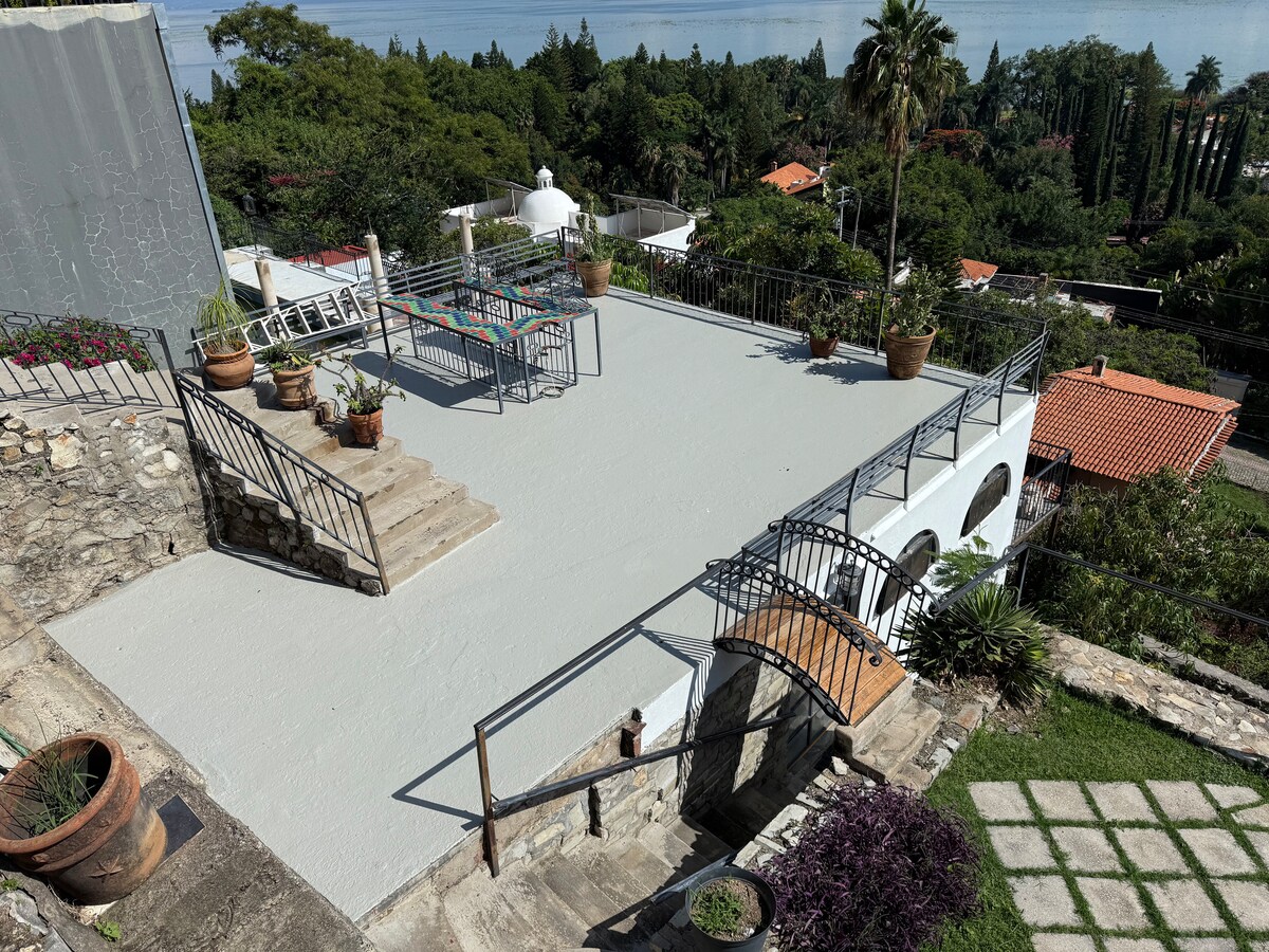 Amplio apartamento con vistas al lago, las montañas y el estanque Koi. Situado a pocas manzanas (a poca distancia a pie) de los muchos servicios de Ajijic. Aparcamiento seguro y designado dentro de los muros de la finca. Cancha de tenis/pickleball, piscina CLIMATIZADA y jardines para que los huéspedes puedan disfrutar. Cocina completa con parrilla en el patio al aire libre y horno para pizzas. Justo es AGENTE INMOBILIARIO y puede responder a cualquier pregunta sobre bienes raíces. Se admiten mascotas en Casa Coco, aunque no tiene un espacio al aire libre adecuado. Tenemos un parque privado para perros.