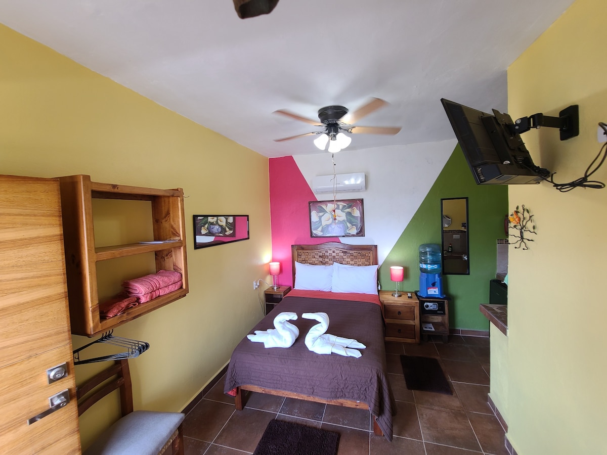 Disfruta de esta suite rústica de estilo mexicano, equipada con una cómoda cama King y una cama individual. Cuenta con cocina propia para tu conveniencia. La decoración cálida y auténtica evoca la esencia de San Pancho, con detalles artesanales y un ambiente acogedor. Ubicada en el tercer piso y a solo una cuadra de la playa, es el refugio perfecto para quienes buscan relajarse en un entorno natural y tranquilo, con todo lo necesario para una estancia inolvidable en la costa del Pacífico.