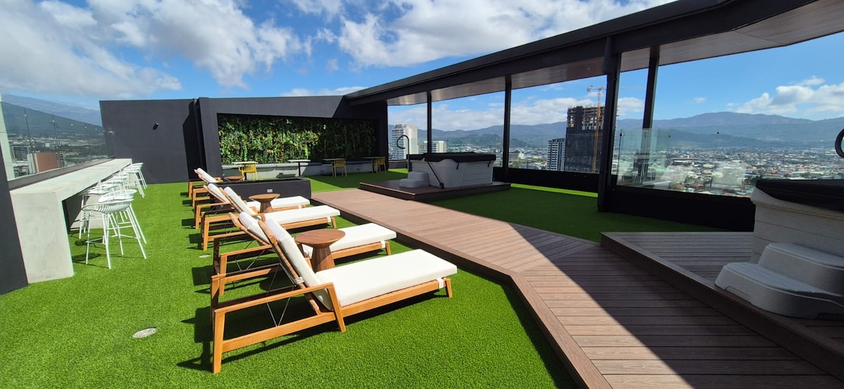 Keep it simple at this peaceful and centrally-located place. Experience the exclusivity of this modern studio in Barrio Escalante, with an unbeatable location just minutes from downtown San Jose, 30 minutes from Tobias Bolaños airport. Enjoy your stay surrounded by smart amenities and beautiful views of the city, complete with Wi-Fi connection, a full-size bed, private bathroom, kitchen and access to superior conveniences, such as a rooftop with jacuzzi and deck, lounge room, gym and BBQ area.