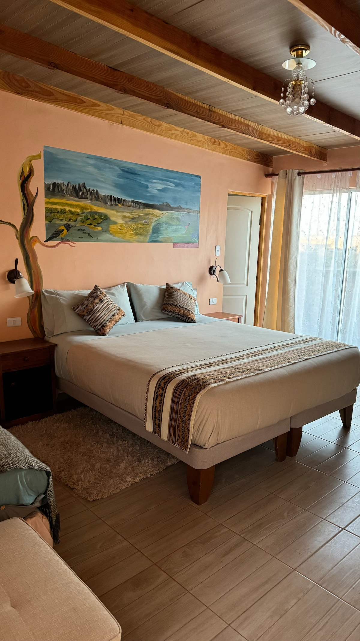 Habitación matrimonial con baño privado, amplia, cómoda e iluminada. Ubicada a solo 10 minutos caminando desde la Plaza Principal, a media cuadra del terminal de buses. Ambiente Tranquilo y familiar. Además, te ofrecemos cocina compartida, sala de estar con tv. terraza, Agua caliente. Wi-fi en todo el establecimiento.