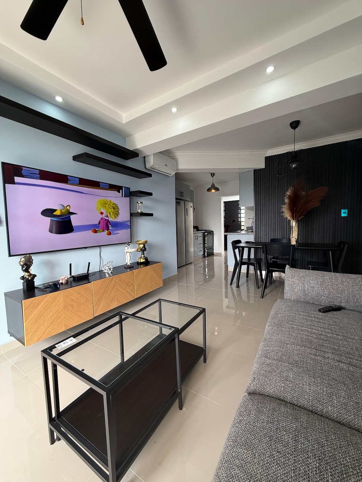 Vive la experiencia de un espacio moderno y céntrico, a solo dos calles del Estadio Tetelo Vargas y supermercados locales y a 15 minutos de las hermosas playas de Juan Dolio. El apartamento ofrece aire acondicionado tanto en la sala como en el dormitorio, que cuenta con una cómoda cama king size, mientras que la sala dispone de un sofá cama full. Además, disfrutarás de Wi-Fi, una cocina totalmente equipada y un área de lavado, diseñado para que tengas una estadía cómoda e inolvidable.