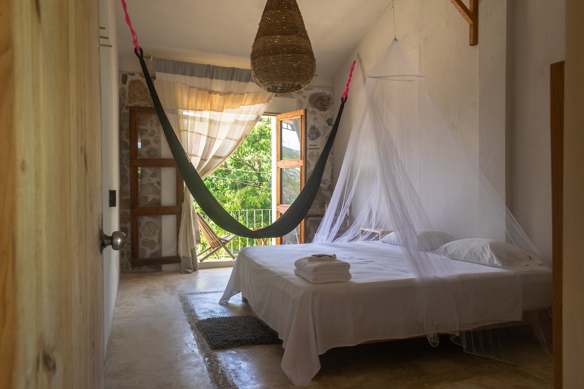 Habitación cama King, baño, balcón, hamaca & Wifi.