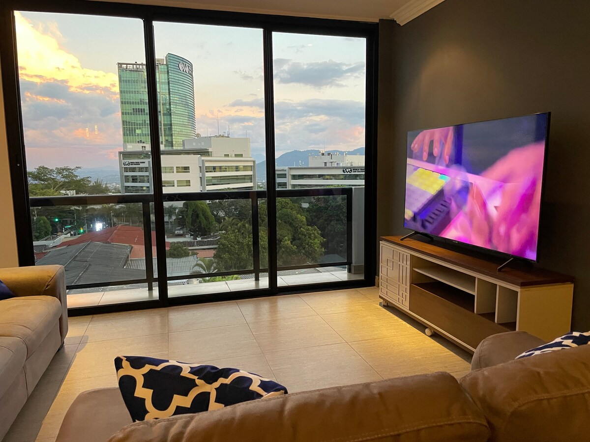 Acogedor, amplio y moderno apartamento en zona céntrica. Tiene una hermosa vista a la ciudad y al volcán San Salvador, ya que se encuentra en el nivel 6. Está muy bien equipado con todo lo necesario para una estancia agradable. Con wifi rápido, TV, agua caliente, aire acondicionado y cocina con todo lo necesario. Piscina en la azotea. Perfecto para familias. Muy bien situado, a menos de 5 minutos de los mayores centros comerciales, restaurantes y bares. Zona segura y exclusiva.