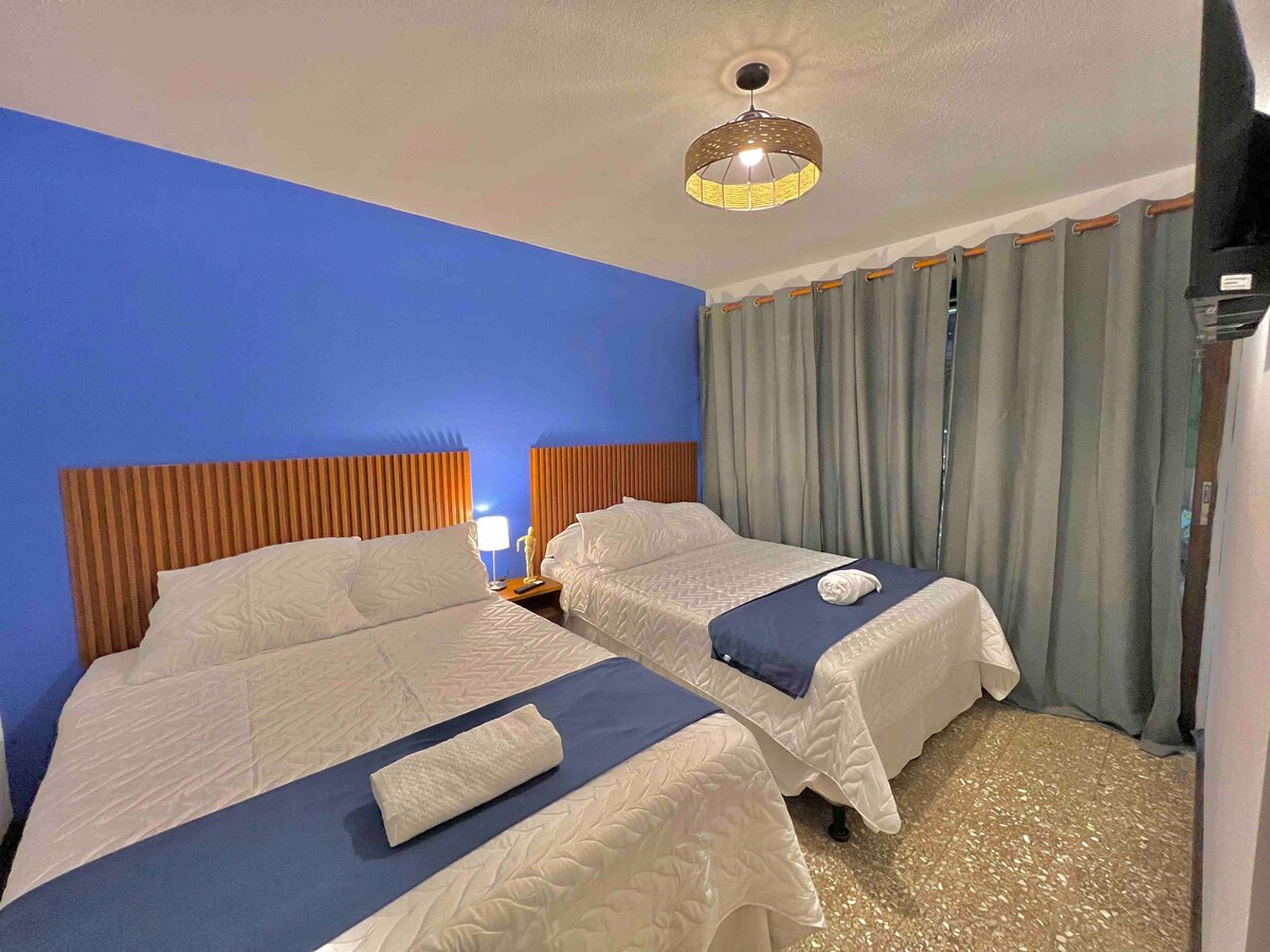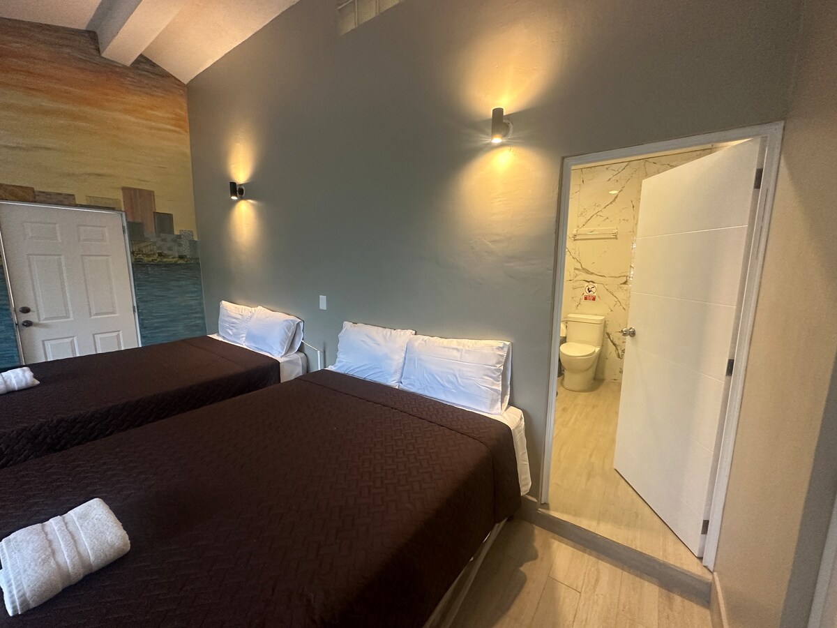 Hermosa habitación con balcón con 2 camas dobles, perfecta para 4 personas. La habitación tiene baño privado, TV inteligente, wifi rápido, armario, ventilador y balcón. La habitación está ubicada en un hotel en la zona 10. La ubicación es muy céntrica, el centro comercial de Oakland está a solo 8 minutos a pie. Hay recepción las 24 horas, los 7 días de la semana y espacio para guardar tu equipaje. La habitación incluye 1 espacio de estacionamiento gratuito.