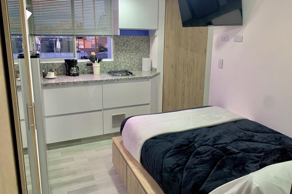 Apartaestudio ideal para 1/2 personas. Cama Queen para el descanso, nevera y cocina equipada para ahorrar en alimentación, baño con agua caliente, escritorio para trabajo/estudios. Ubicado en zona residencial tranquila pero cerca a comercio, ideal para resolver cualquier necesidad. A 15 min. del aeropuerto el Dorado en vehículo, a 15 min. a pie del CAS de la embajada de EEUU para trámite de visa, CC Nuestro Bogotá y cerca a transmilenio. Disponibilidad de Parqueadero cubierto para moto.