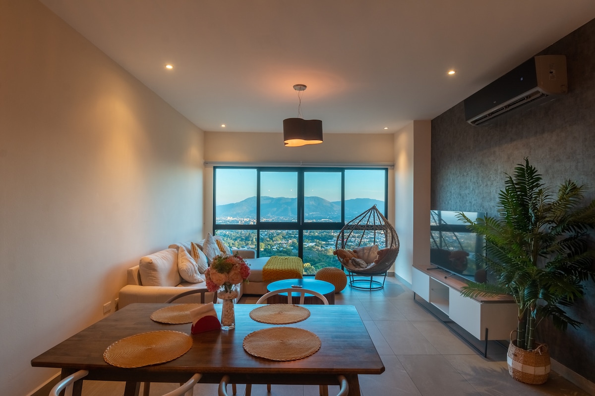 Moderno apartamento totalmente equipado con vistas panorámicas al volcán de San Salvador. Ubicado en el 9no piso de un complejo residencial en Santa Tecla, es ideal para trabajar, descansar y relajarse. Rodeado de amplias zonas verdes y áreas recreativas que ayudan a equilibrar tu día entre trabajo, familia, ejercicio y descanso. Cerca de supermercados, restaurantes y todo tipo de comercios, con acceso ágil a las principales carreteras hacia San Salvador, La Libertad y el occidente del país.