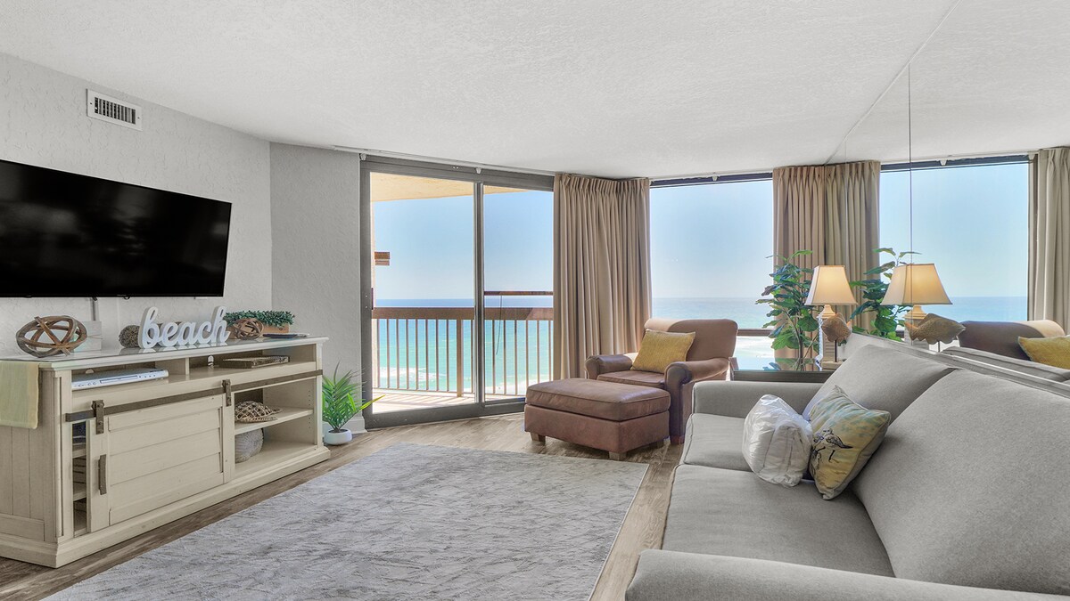 Este condominio frente al golfo de 2 dormitorios y 2 baños en el condominio Sundunes se encuentra en el sexto piso y tiene fantásticas vistas de la playa de arena blanca y el agua esmeralda del Golfo de México. Es una unidad del extremo este y tiene vistas a toda la isla desde la sala de estar principal y el balcón. El dormitorio principal también está frente al golfo y tiene una puerta corrediza de cristal que conduce al balcón. Lavadora y secadora en el condominio. Incluye TV por cable e internet inalámbrico. También hay una piscina comunitaria.