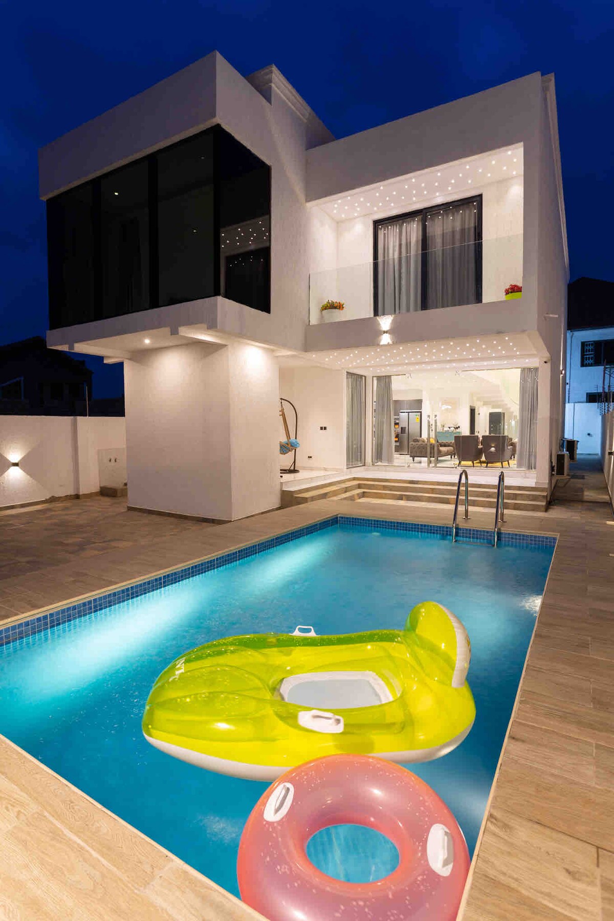 Piscina ☞ privada (extremo poco profundo de 3,5 pies, extremo profundo de 6,5 pies, piscina 10x23) 🏊 Wifi ☞ Starlink demás de 250 Mbps ✭ Cómodas camas tamaño king (180x200 cm) 🛏️ SUV ✭ privado de lujo de 7 plazas con chófer 🚘 Limpieza ✭ diaria disponible 🧹 Generador ☞ de respaldo para energía las 24 horas, los 7 días de la semana Alojamiento de ☞ 3850 pies cuadrados ☞ 5 televisores inteligentes con Netflix DSTV y canales locales (el más grande es de 75 pulgadas) ☞ Estacionamiento (en el lugar, 4 autos) ☞ Lavadora + Secadora ☞ Samsung 11.1.4 Altavoces Bluetooth de sonido envolvente ☞ Cocina totalmente equipada y abastecida ☞ Aire acondicionado 》De 25 a 30 minutos del aeropuerto