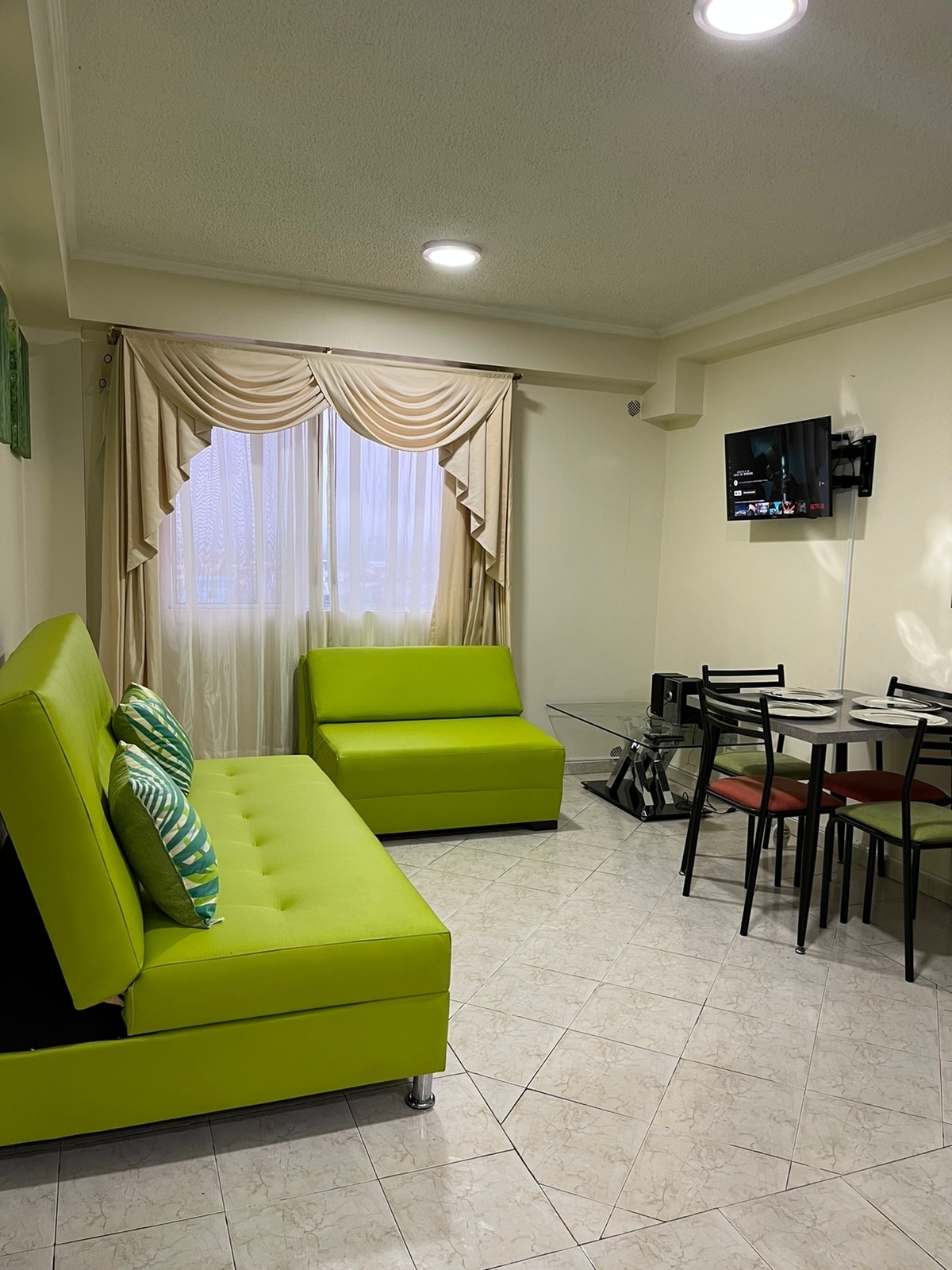 Disfruta de una estadía de lujo en este elegante departamento ubicado en una urbanización privada cerca de los mejores restaurantes , centros comerciales y más atracciones una zona estratégica con parqueadero privado, comodidad , con ayuda de Alexa una maravillosa experiencia te espera! Nuestro departamento •El departamento tiene una cama de 3 plazas •Jacuzzi •A/C •Alexa •En la sala 2 sofá cama de 2 plazas Disponibilidad para más personas en el departamento Te esperamos