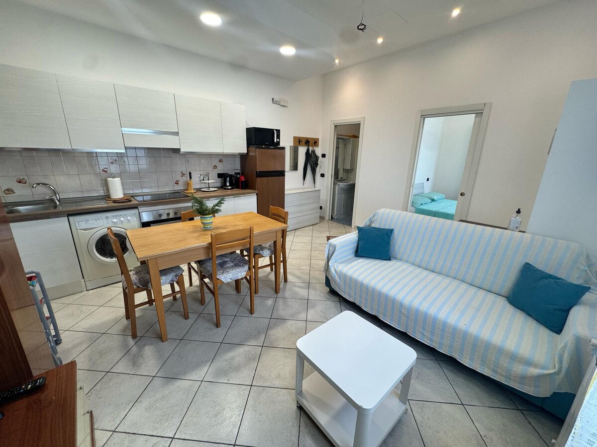 Apartamento acogedor, luminoso y tranquilo, recientemente amueblado. Entrada independiente, en un pequeño condominio de casas adosadas. A pocos pasos del MAR y del CARRIL BICI que atraviesa varios municipios costeros de la provincia de Imperia. Amplio (unos 70 m²), con un gran patio disponible. WI-FI. Porche con mesa y sillas para comer al aire libre. PLAZA DE APARCAMIENTO PRIVADA frente al alojamiento, entrada con cancela de mando a distancia. AIRE ACONDICIONADO - Calefacción independiente