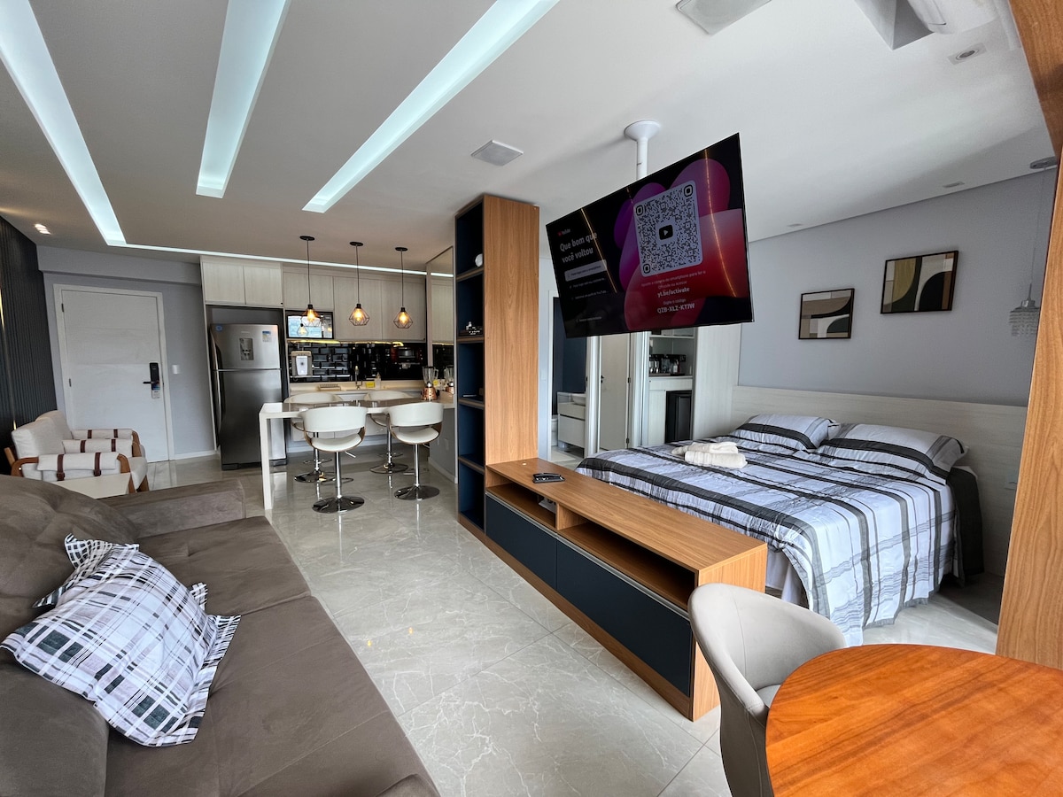 Viaja en la comodidad de tu casa de playa. A una cuadra de la playa, ideal para hacer turismo e incluso trabajar. Hay estacionamiento disponible en las instalaciones, recepción las 24 horas, asistencia de mantenimiento, ¡todo para su bienestar! Tenemos una suite con una cama tamaño queen y un sofá cama doble en la sala de estar, ¡que puede alojar hasta 4 adultos! Hay aire acondicionado en las habitaciones y en la sala.