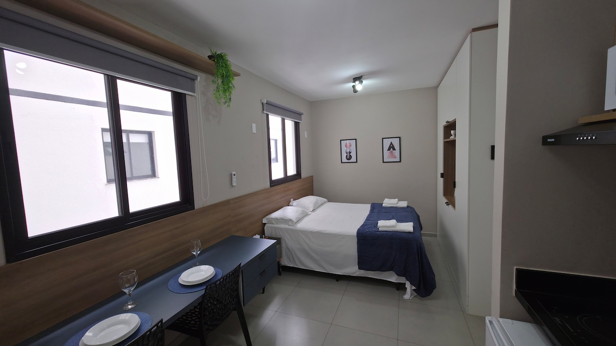 Estudio muy bien decorado, equipado, limpio, nuevo y con una excelente ubicación. Cerca de la USP, el centro y varios restaurantes, un lugar tranquilo para que te sientas como en casa. ¡Estudio con una cama grande de matrimonio, un baño, armario, sofá, televisión, wifi, nevera, cocina, microondas, cafetera, entre otras cosas!