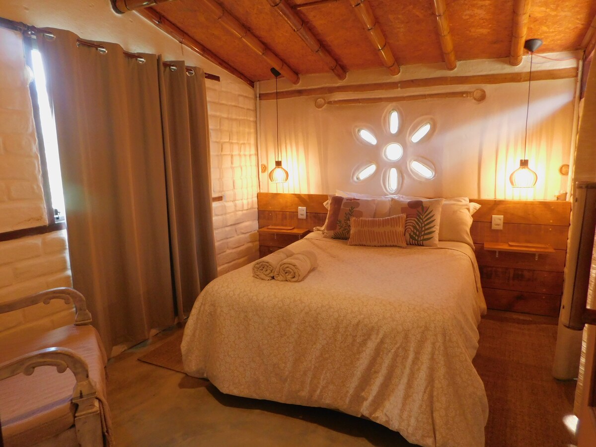 Hermosa casa con arquitectura ecológica en bambú y adobe. Para aquellos a los que les gusta estar en contacto con la naturaleza, sobrevolado por guacamayos y tucanes, con una hermosa vista del amanecer y la luna reflejada en las montañas. • Perfecto para 2 personas, 1 dormitorio con cama doble y 1 sofá cama en el entrepiso; • Smart TV en la habitación. • Alexa • Bañera de inmersión al aire libre • 1,2 km del centro de Alto Paraíso; • desayuno opcional • Excelente ubicación para los amantes de la tranquilidad, al mismo tiempo cerca del centro