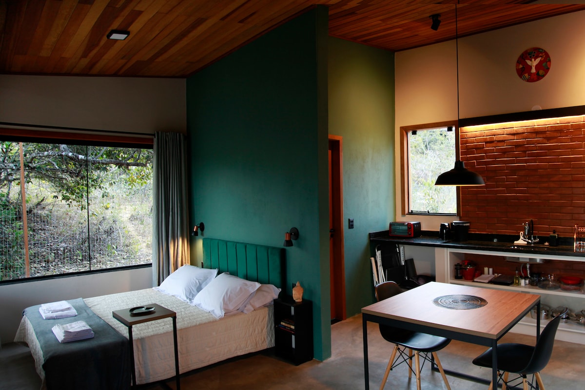 Nuestro chalet está totalmente integrado en la naturaleza. Tiene grandes marcos de vidrio y la búsqueda gratuita de Cerrado y las montañas que ofrecen una vista espectacular. Cocina completa, ropa de cama y baño de primera categoría, gran ducha climatizada, vestidor y cama con colchón de hotel de 5 estrellas. Hay un balcón con una terraza a lo largo de toda la longitud del chalet ,con mesa y sillas en el exterior para que los huéspedes puedan contemplar la naturaleza y el cielo estrellado de Chapada - tomar un vino, por supuesto. =)