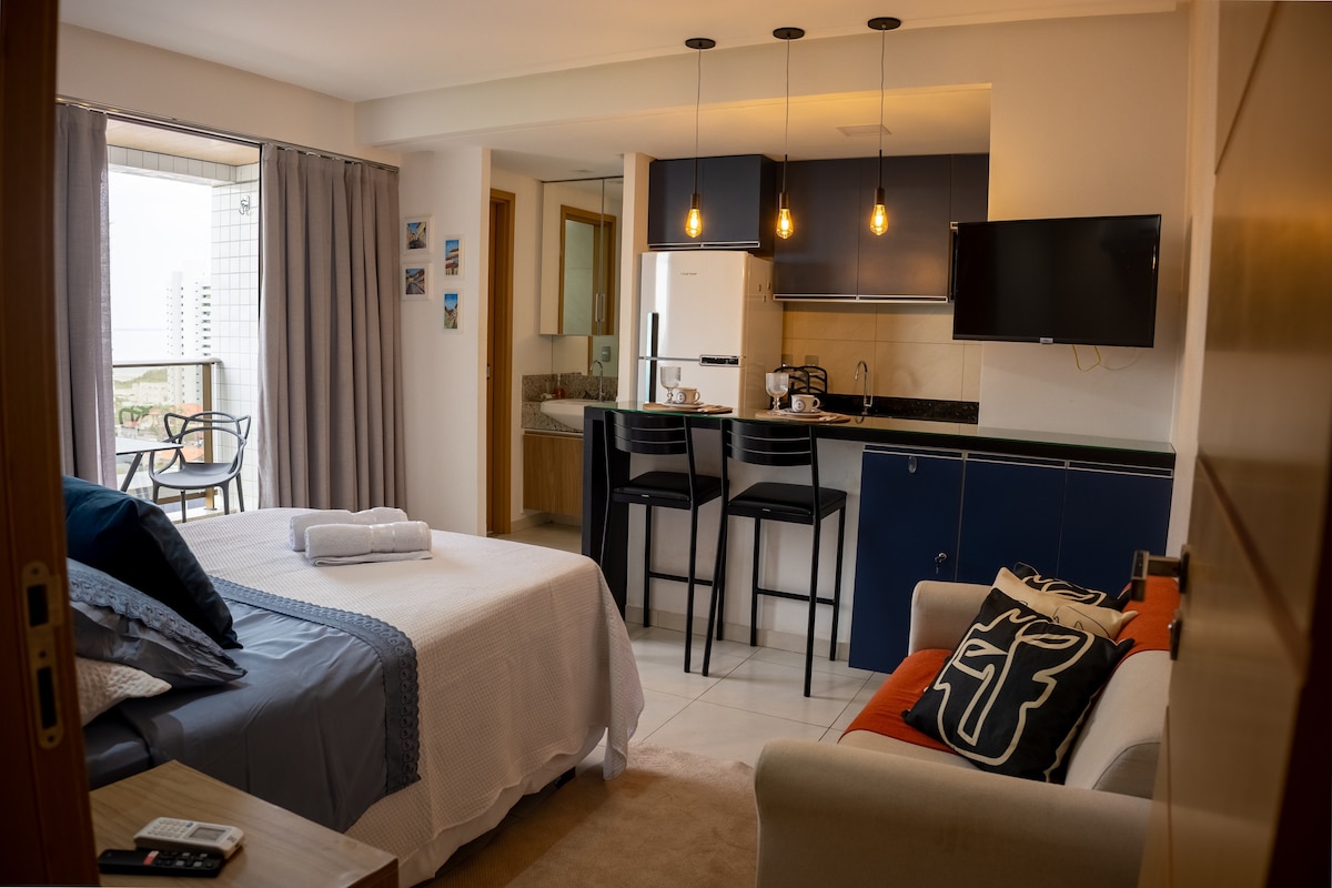 Studio model apartment, located on Avenida dos Holandeses, in the Calhau neighborhood. With 30 m², it features a balcony with a city view. The space combines bedroom and living room with an open-plan kitchen and private bathroom. The apartment accommodates up to three people and has a digital lock on the door. The condominium offers a complete leisure area, remote concierge, 24-hour reception with doorman, and a parking space. Located near beaches, supermarkets, and restaurants.