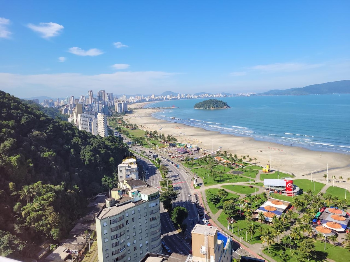 Hermoso estudio con MAGNÍFICA vista al mar, embarcaciones (barcos, lanchas, veleros, jetski, stand up); puente colgante y una puesta de sol increíble. Situado cerca del restaurante y cervecería "Terraço" con una fantástica gastronomía, vista panorámica de la Baixada Santista, música en vivo y ambiente acogedor. En los alrededores tenemos paseos en barco, morro da Asa Delta, centros comerciales, emisario, teleférico, visita al acuario de Santos, paseo turístico en tranvía, praça das bandeiras, ciclovía y paz
