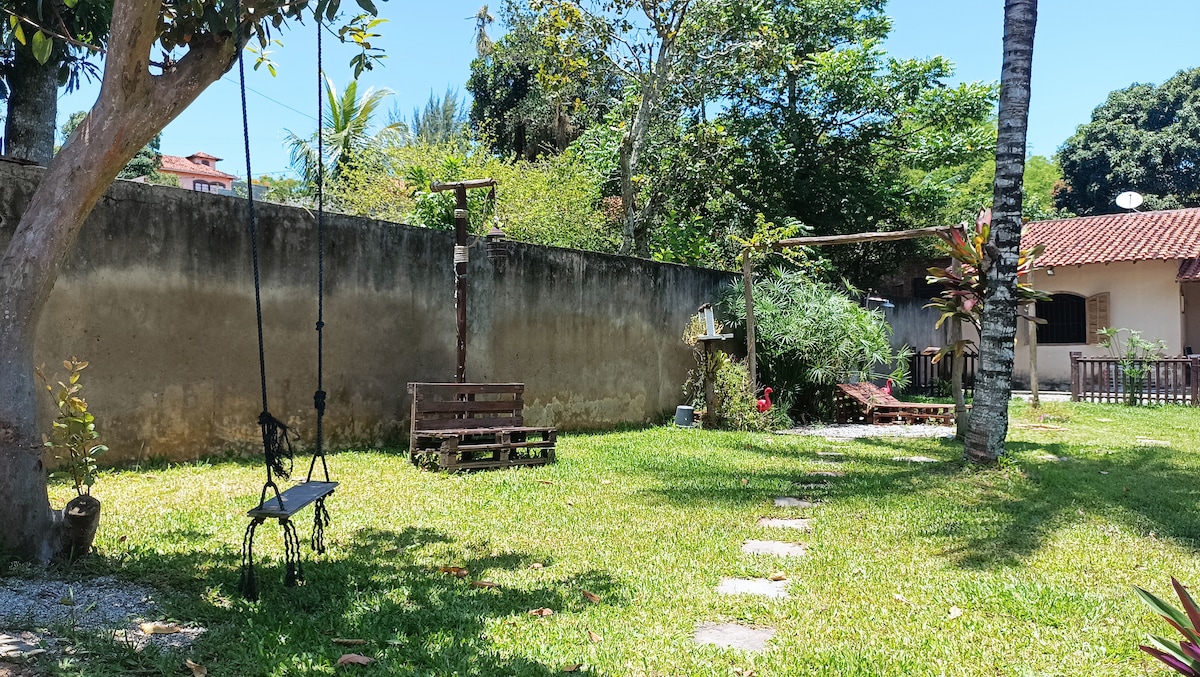 Refúgio aconchegante para 2 em Saquarema! Casa com ar condicionado, Wi-Fi e espaço de trabalho. Desfrute de um quintal de 900m² com árvores e rede, perfeito para pets. A apenas 1,5 km da Praia de Itaúna. Inclui churrasqueira, bicicletas e estacionamento. Ideal para relaxar perto da natureza e do mar.
