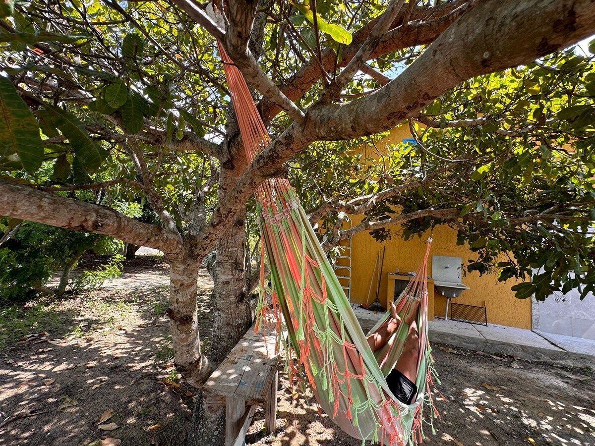 Tómate un descanso para relajarte en este sereno oasis. Cerca de la playa de Itaúna (2 km), rodeado de vegetación y un huerto lleno de frutas. Despiértate con el sonido de los pájaros en un ambiente acogedor. Extiende la red a la sombra de los árboles de mango o de cajueiro y respira hondo mientras disfrutas de la brisa. Tenemos una cocina completa, aire acondicionado y un gran patio para que tu mascota se sienta como en casa.