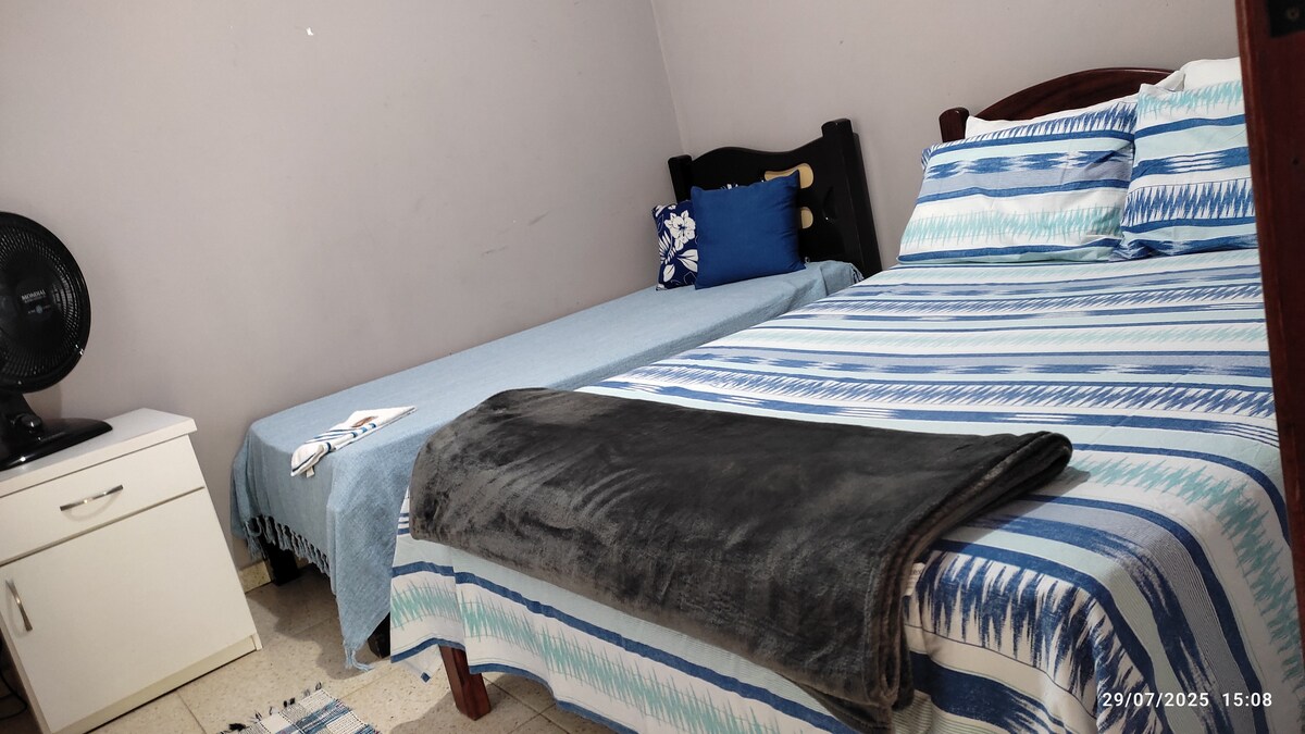 Segundo piso de 2 dormitorios, baño y cocina. Habitación 1, con aire acondicionado y ventilador de techo, TV y armario, para preparar para hasta 4 personas, con 1 cama de matrimonio y 2 individuales. Dormitorio 2, con ventilador de techo y armario para preparar con 4 camas. Ofrecemos ropa de cama, almohadas y toallas. Cocina con cocina de gas de 4 hornillas y horno, microondas, nevera dúplex y otros utensilios de uso exclusivo. Patio con zona cubierta, baño con ducha y aseo compartidos.
