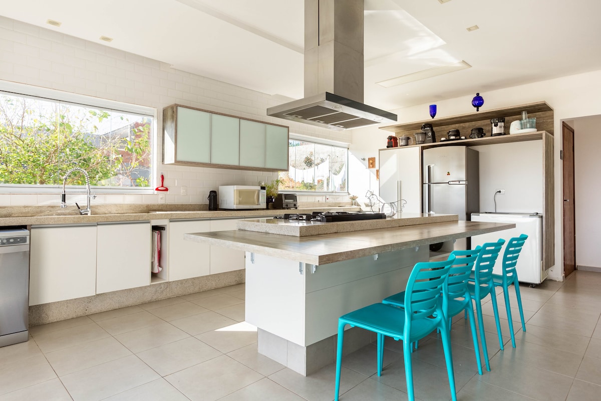Villa con chimenea y jardín privado; lugar plano con mucha naturaleza alrededor; Disfruta de mañanas tranquilas en nuestro balcón soleado y la alegría de los momentos familiares, perfectos para un desayuno relajante con vistas al jardín y a la piscina, y disfrutando del canto de los pájaros; Alto Wall, seguridad para tu mascota; Internet wifi 480 mega de fibra óptica; Parrilla; Piscina con agua, luces; Ambiente familiar para toda la familia ; Ofrezco ropa de cama, excepto toallas de baño.