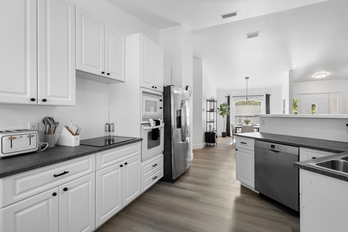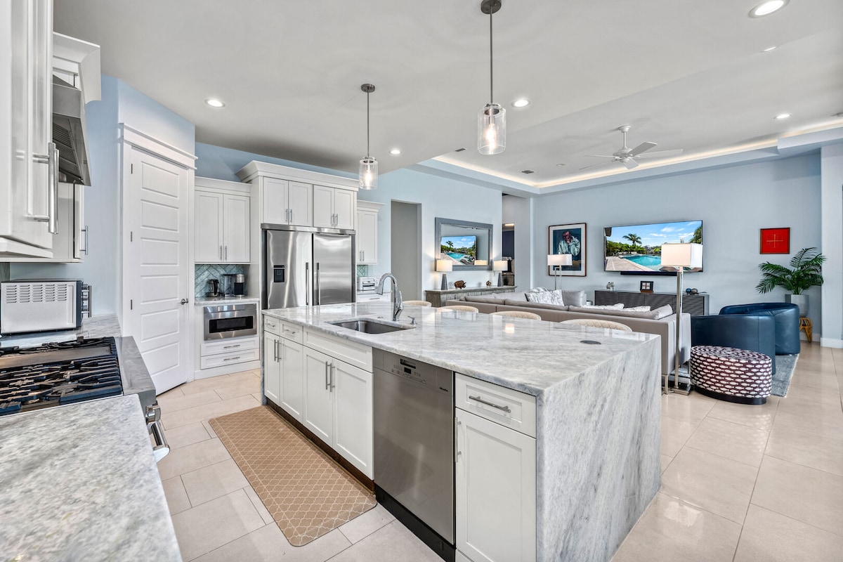 Bienvenido a Vistalodgings Villa Del Sol, donde las familias se divierten ☀ 3 dormitorios: 1 cama king, 1 queen, 1 completa, 1 doble y 2 baños completos Cocina ☀ totalmente equipada: cafetera doble Keurig, gofrera, freidora de aire, hervidor eléctrico, licuadora, batidora, ollas y sartenes ☀ Comedor para 8 Internet ☀ wifi de alta velocidad Piscina ☀ climatizada gratuita ☀ Cargador para vehículos eléctricos ☀ Shuffleboard, arcade de Pac-man ☀ 5 televisores inteligentes con Disney Plus ☀ Bicicletas, tumbonas, sombrillas, nevera, juguetes de playa ☀ Plancha