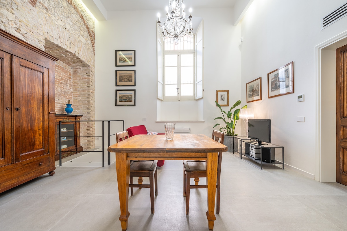 We are in the heart of the Castello district, and passing through a historic arch we enter an inner courtyard which houses Scuderie Reali, a distinctive 35mq loft This small enclave, where today we find several dwellings, once housed the royal stables. The loft has recently undergone a painstaking renovation project while retaining the characteristic elements of the stable itself. A livingroom, an equipped kitchen, a lofted sleeping area and a bathroom were thus created from the former stable.