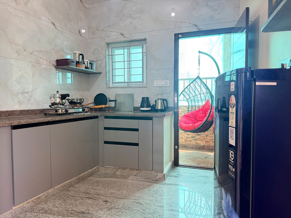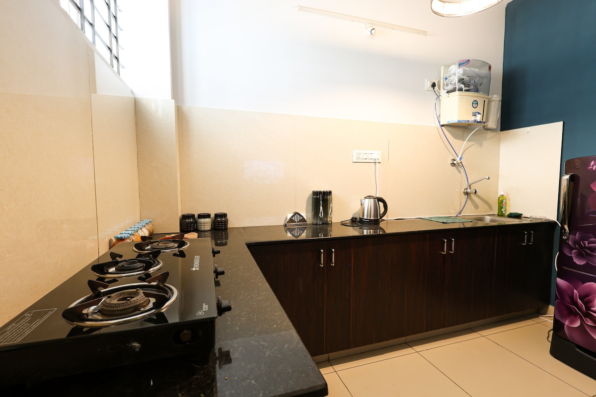 Feel like you’ve escaped the city without leaving it. Wrapped in greenery, this bright, spacious, east-facing first-floor home in the Electronic City area is in a quiet gated community, 1 km from Hosur Rd (NH44). Ideal for families, professionals, or longer stays, it offers two bedrooms with attached baths plus private sleeping areas and a fully equipped kitchen. Includes 55" Smart TV, 200 Mbps WiFi, washing machine, large fridge, parking, and 24/7 security. Clean, comfortable, peaceful, homely.