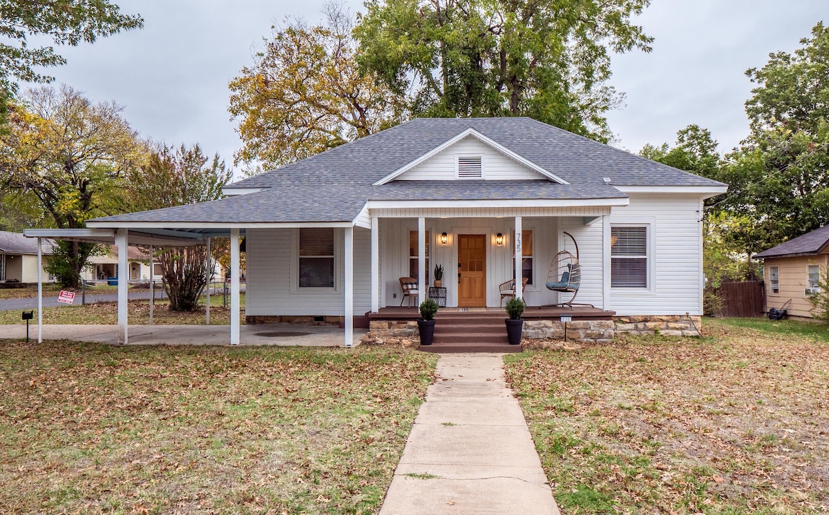 Te encantará sentarte en el porche delantero y ver a los peatones, ciclistas, etc. al otro lado de la calle. Sala de estar abierta al comedor y a la cocina. El dormitorio principal tiene ducha a ras de suelo. También hay un baño completo en el pasillo. Wifi y TV de pantalla ancha con streaming. Mucho espacio en el armario. Cocina totalmente amueblada. Frente a una hermosa pista para caminar, el campo de béisbol Mike Deak McAlester HS y los campos de fútbol. Calle bien iluminada. Garaje pequeño y estacionamiento adicional en la entrada.