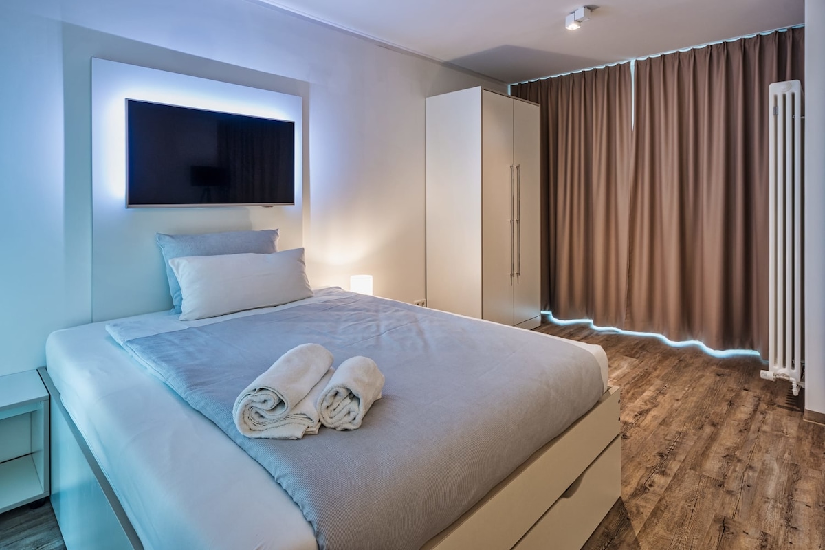 Willkommen zu Hause in diesem frisch renovierten Apartment! Genießt den Aufenthalt mit Küche, großem Bett und modernem Badezimmer! → Perfekt für 1-2 Personen: Queensize Bett (1,60m) → Eignet sich perfekt für Geschäftsreisen → Eigenes Bad mit Dusche → Eigener Balkon → Arbeitsplatz zum Essen oder Homeoffice → 50' TV inkl. gratis WLAN → großes Parkhaus 2 Min. zu Fuß entfernt