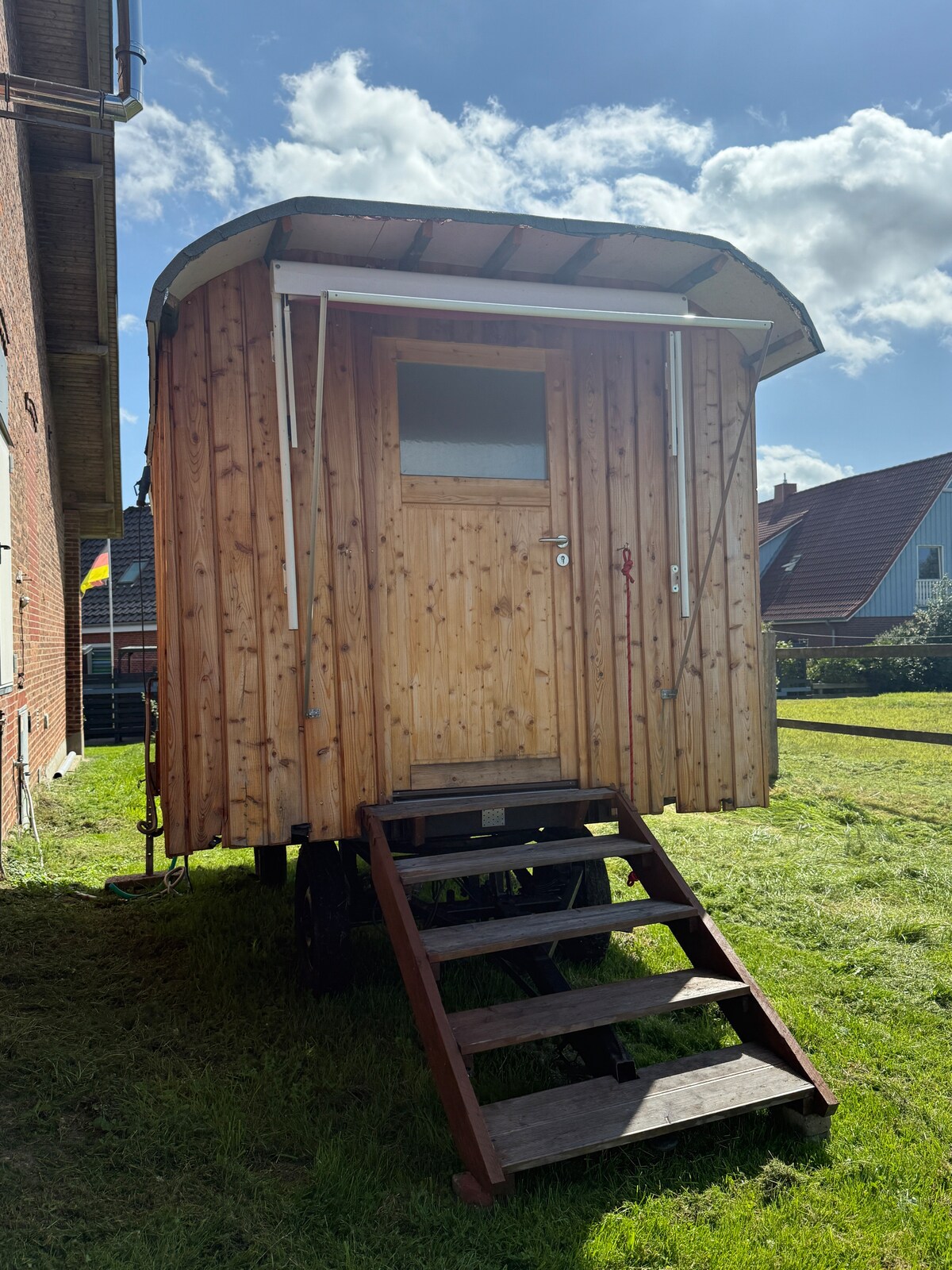En medio de campos y Knicks, encontrarás un lugar tranquilo en el borde del campo con vistas panorámicas al mar Báltico, a la playa del mar Báltico se puede llegar en 20 minutos en bicicleta. Te espera un remolque de construcción grande de 14 m"recientemente desarrollado con una cama (160), una pequeña cocina pequeña y un asiento dentro/fuera. El inodoro y la ducha se encuentran en otro remolque de construcción al lado. Las verduras y huevos frescos de nuestro jardín están disponibles según la temporada:)