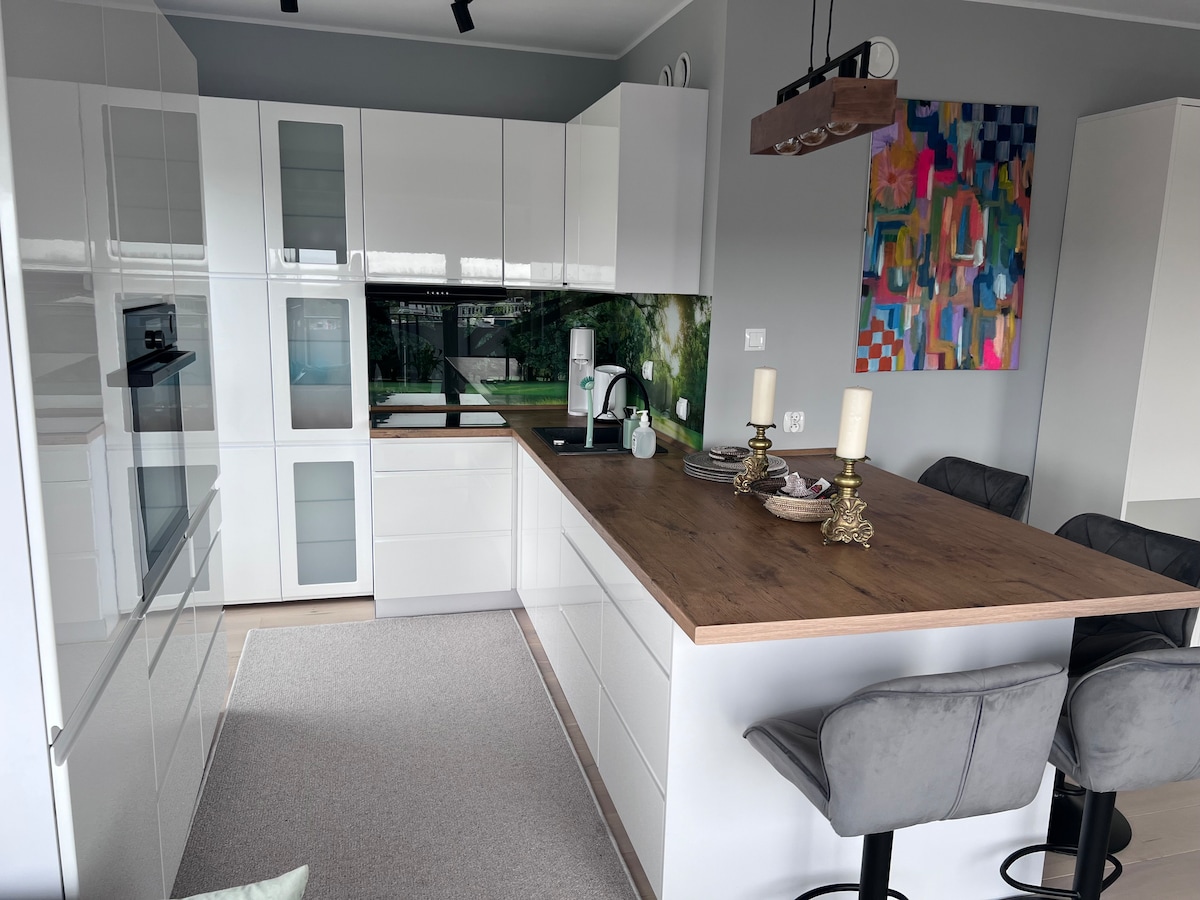 El apartamento de dos dormitorios tiene un tamaño total de 59 m² e incluye 2 baños (ducha/bañera con secador de pelo y cosmético profesional), una sala de estar con sofá cama y TV, un dormitorio doble con TV y un dormitorio individual. También tiene un gran espacio de gabinetes, una cocina totalmente equipada con lavavajillas, lavadora y cafetera, mesa de comedor. Puede alojar hasta 3 adultos y un niño/bebé (un niño de hasta 9 años en un sofá cama y/o un bebé en una cuna adicional).
