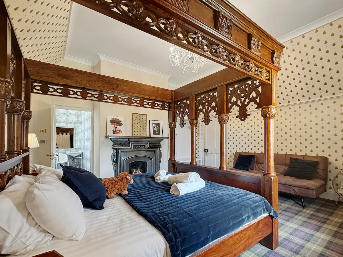 A charming room in our Victorian house. This elegantly decorated room features a king bed, offering unparalleled sleep as you take in the breathtaking mountain views of Beinn a’ Bheithir and our tranquil garden. The Farrow & Ball wallpaper adds a whimsical touch, inspired by the adventures of a supernatural character, ensuring that your stay in Larch is both enchanting and restful.