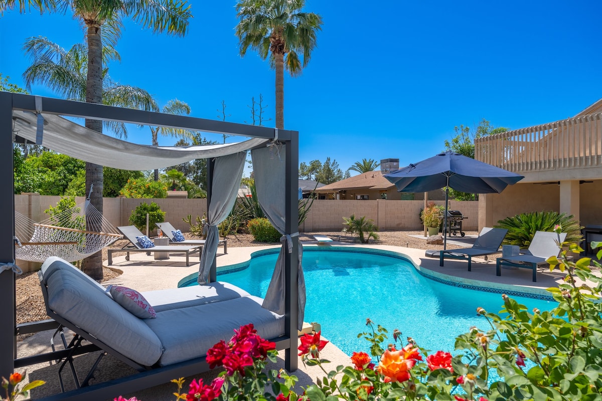 Descubre tu elegante oasis en South Scottsdale, a pocos minutos del casco antiguo. Este refugio de 4 dormitorios con 7 camas cuenta con todos los muebles nuevos, televisores en todas las habitaciones, mesa de billar, juego de arcade y colchones de espuma viscoelástica. La casa completamente remodelada ofrece un deslumbrante mural al atardecer mientras caminas hacia el espacioso patio trasero para juegos, barbacoa, hamaca, mesa de comedor al aire libre, muchos asientos y una hermosa piscina de buceo con calentador eléctrico (consulta para obtener más información). ¡Pasa el mejor momento en este relajante refugio!