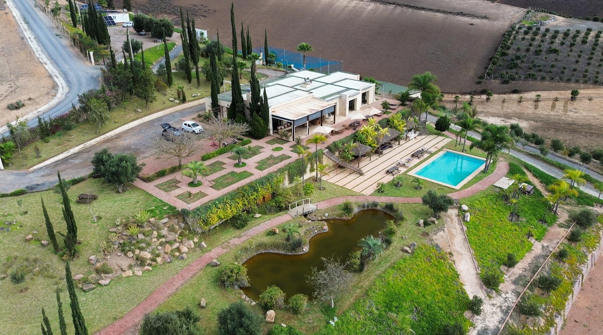 Una suntuosa granja de 5 ha, situada en Sidi Allal Bahraoui a solo 40 minutos de Rabat. La casa tiene unas vistas excepcionales del campo. Espacio 100% privado con mucho encanto para los amantes de la naturaleza. El aparcamiento es gratuito y la piscina es privada y sin vecinos. Las instalaciones son modernas y elegantes. Se pueden realizar paseos a caballo en el lugar. Este relevo campestre le deleitará con su encanto y comodidad. ¡Cambio de aires garantizado!