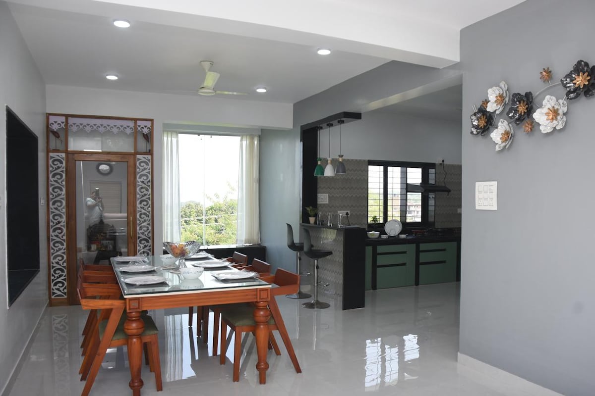 Luxury Banjara Hills Retreat Hyderabad's finest. A 5-star alternative in the most prestigious neighborhood. Accommodation: King Master Suite (designer decor, LED light, blackout). Bathrooms: Two luxury baths with rain showers/glass enclosures. 3 in Total Kitchen: Fully equipped; includes washing machine. Features: Full A/C, marble floors. Proximity: Steps from high-end dining, shopping, and business centers.