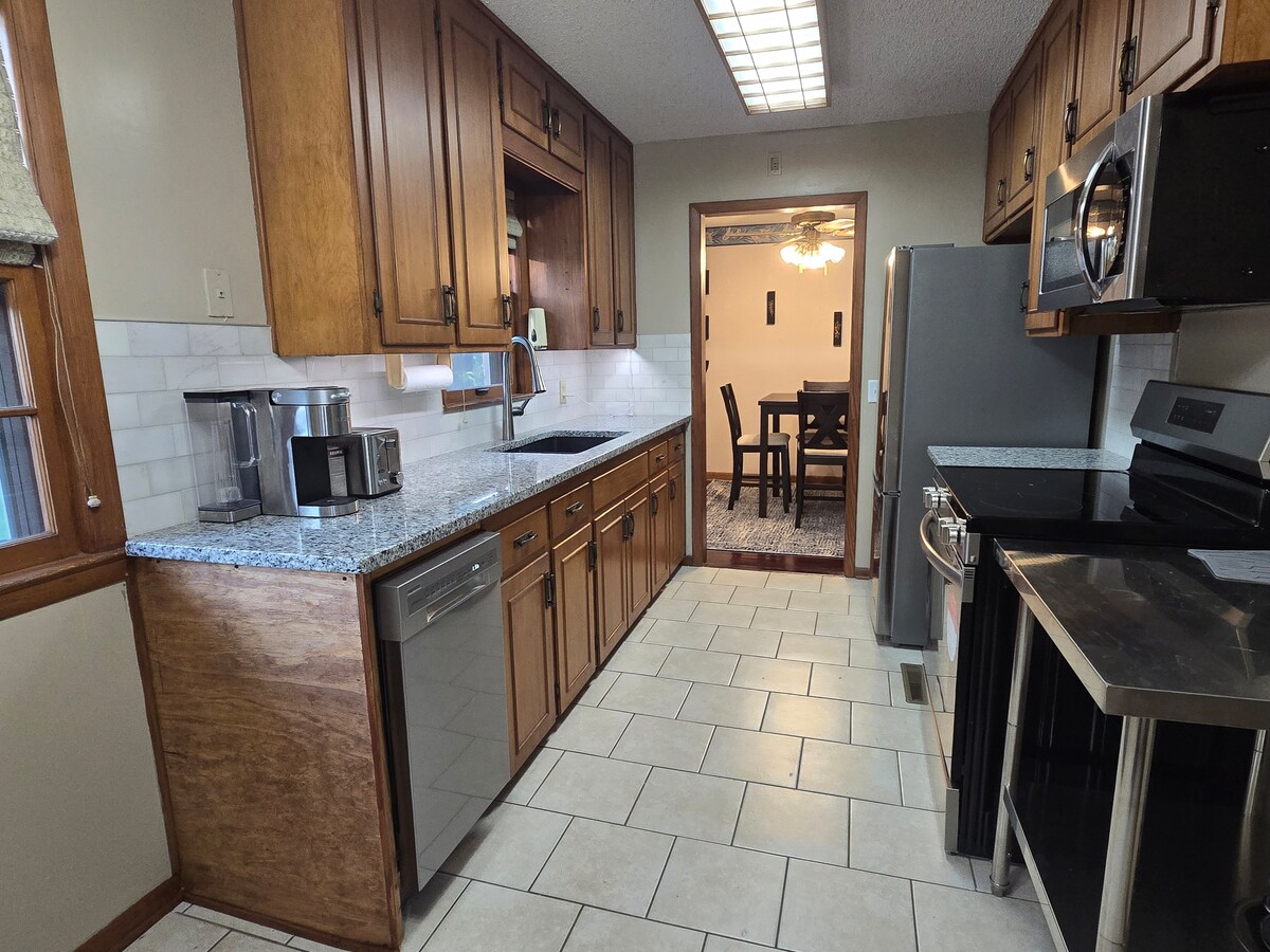 ¡Disfruta de esta casa recién remodelada, de 2200 pies cuadrados, limpia, de 4 dormitorios y 2 baños en East Wichita, ubicada en un barrio tranquilo y seguro! ¡Cerca de Town East! ¡Con licencia para 8 adultos, 16 reuniones! Convenientemente ubicado en East Wichita @ 54/Kellogg & Rock Rd. ¡A poca distancia en auto de Bradley Fair, restaurantes, seguridad en vuelos, McConnell AFB y hospitales! ¡Disfruta del televisor LG de 75 pulgadas en el sótano y los nuevos acabados! ¡El precio base incluye hasta 8 huéspedes adultos! + 15 $/día por cada huésped > 8. Los perros son bienvenidos, pero deben registrarse con el anfitrión. ¡No se admiten gatos!