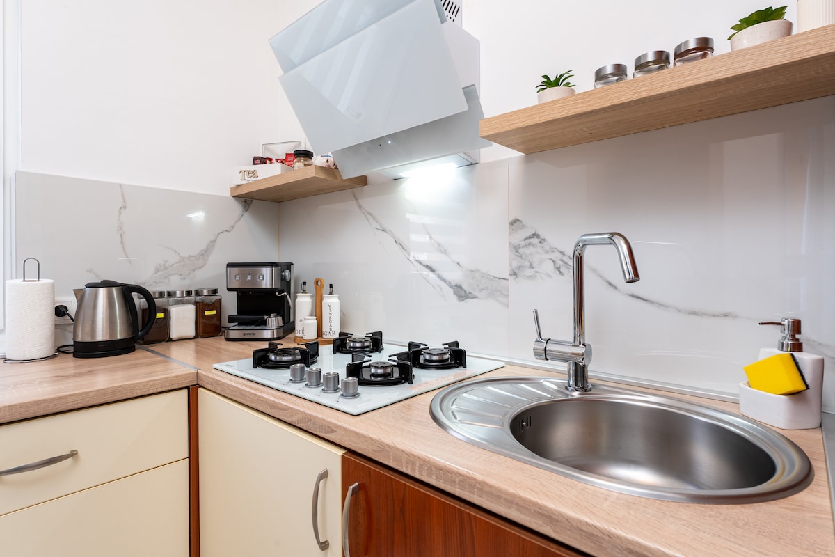 Apartamento hermoso, agradable y nuevo con sala de estar y cocina, 1 dormitorio y baño. El apartamento está situado en el centro de Osijek, cerca del parque Zrinjevac y de la estación de autobuses. El apartamento está recientemente renovado y totalmente equipado, con aire acondicionado y conexión WiFi gratuita. El apartamento incluye una plaza de aparcamiento gratuita en el garaje subterráneo a 50 m del apartamento, que debe reservarse al reservar el apartamento.