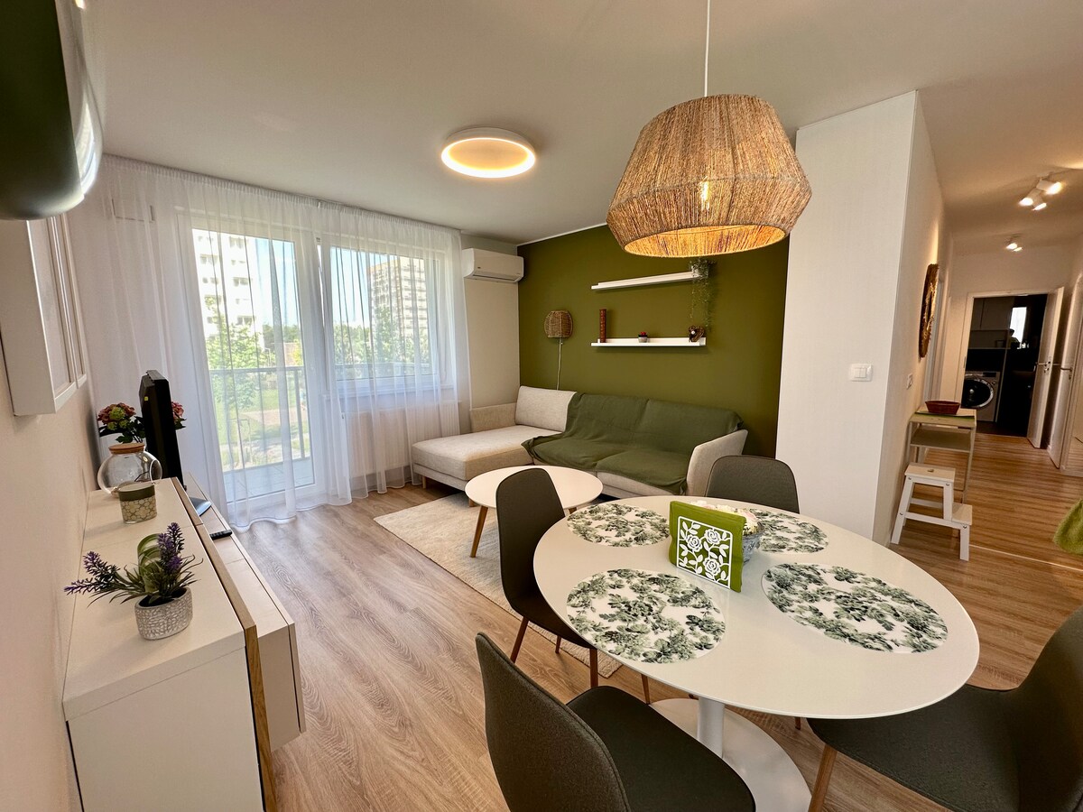Brand-new, modern and bright apartment in a quiet residential area near the airport. Enjoy panoramic views of Bratislava Castle and the Kamzík TV Tower. The flat is spacious, fully equipped (kitchen, bathroom, AC, TV, Netflix, WiFi) and perfectly soundproof. Bistro is in the building, groceries and café 1 min away. Great connections to the center, mall and station. Located in a new building in a calm, safe and fully family-friendly area. Parking included. Your perfect home in Bratislava.
