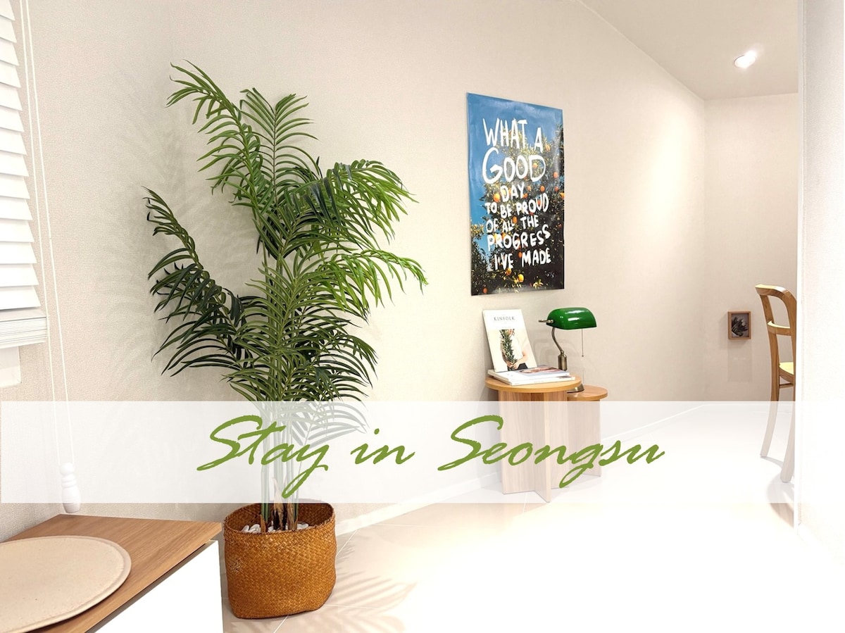 Stay in Seongsu · 2 habitaciones 4 camas · 5 minutos de la estación de Seongsu · Amplio y limpio · TV y aire acondicionado en cada habitación · Lavadora y secadora · Sala de estar · Cocina