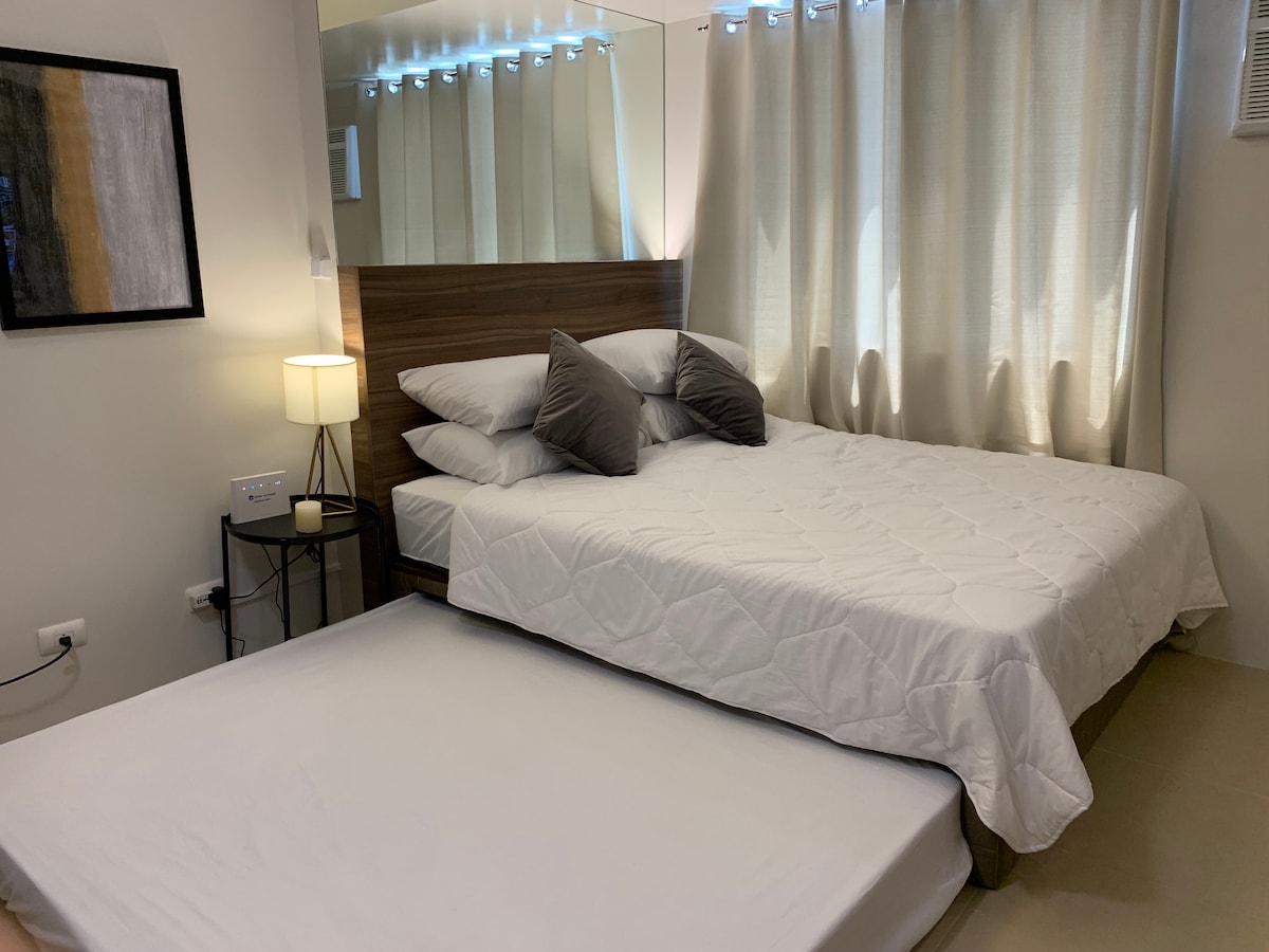 Queremos compartir la tranquilidad de nuestro espacio con otras personas de ideas afines que buscan un descanso de la vida rápida de la ciudad. Nuestro alojamiento es una unidad de un dormitorio de 50 metros cuadrados con un amplio balcón, más espacioso que otros en el mismo rango de precios. Es ideal para una pareja o una familia de 2 adultos y 1 niño. Uso de la piscina: consulta los detalles proporcionados en la descripción del anuncio. El estacionamiento NO está incluido, pero se puede proporcionar para P250/noche. Tarifa por llegada tardía después de LAS 4:00 P. M. Simplicidad. Paz. Sin complicaciones.