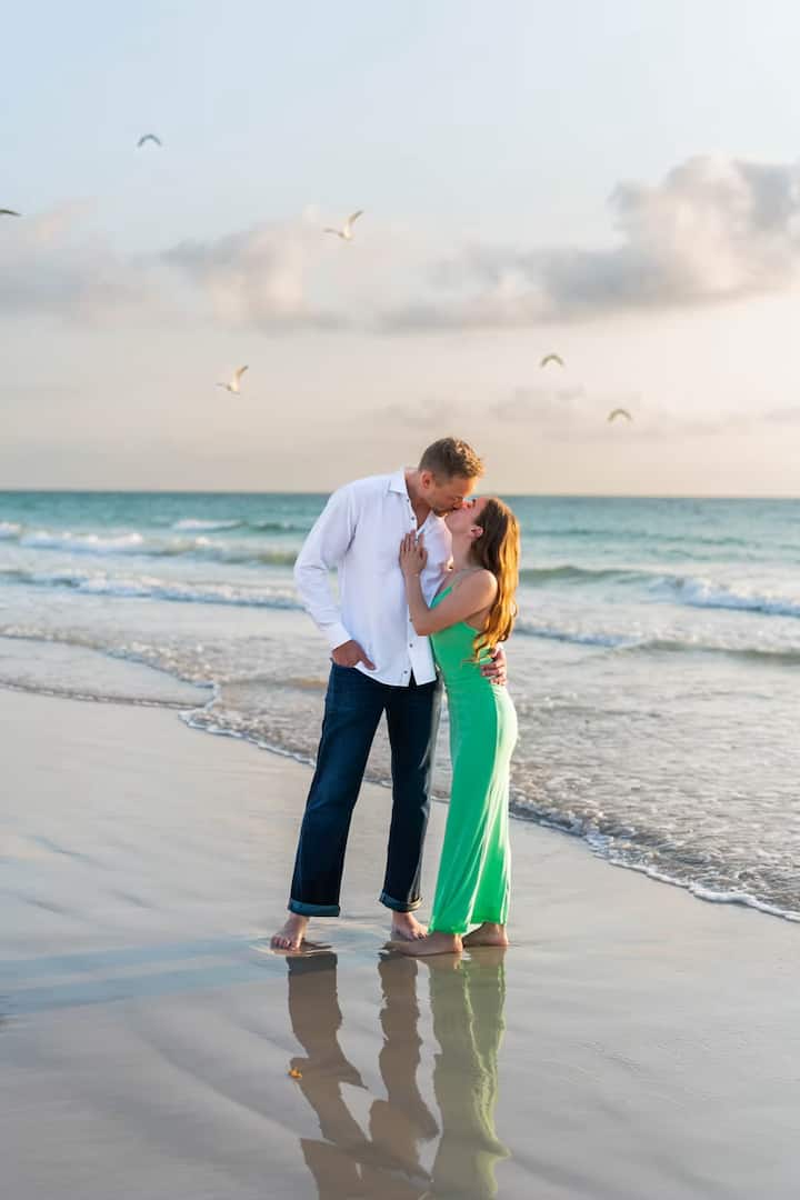 Esta es una sesión de fotos privada en la playa para dos personas, en la que se capturan imágenes naturales de estilo editorial llenas de conexión y calidez.
