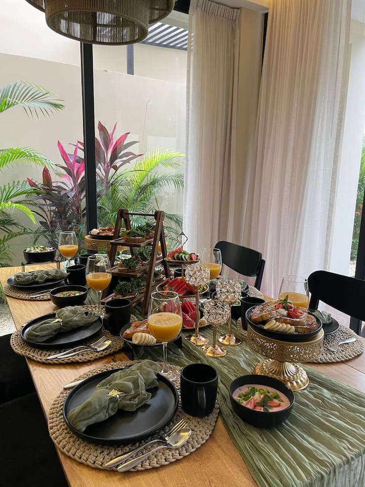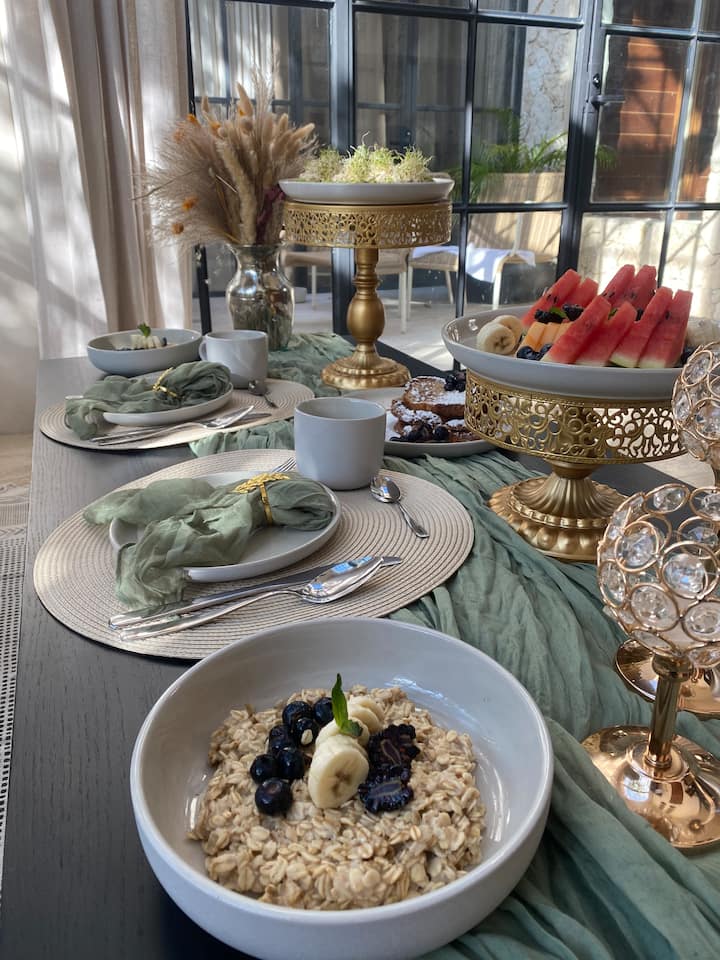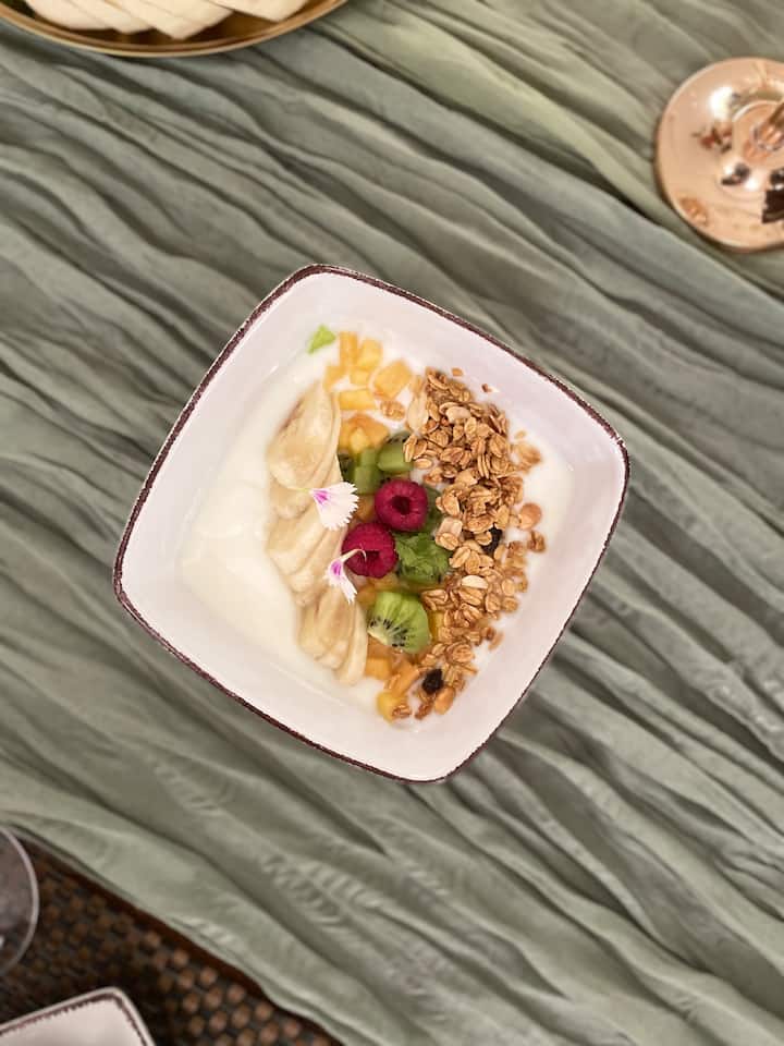 cafe / bowl de avena y frutas frescas / tostada de aguacate y huevo / brochette de mini hotcakes con miel de maple