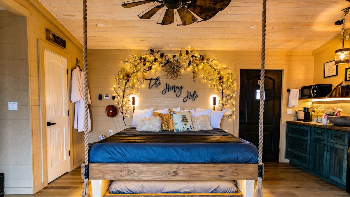 El romance está en el aire en este nuevo refugio en la casa del árbol. Sube la escalera privada a tu refugio en la copa de los árboles y déjate sorprender por las impresionantes vistas al lago desde todas las ventanas. Este acogedor estudio cuenta con una lujosa cama tamaño queen, ducha con efecto lluvia y una bañera de hidromasaje privada con vistas al lago Douglas. Relájate en la terraza, sumérgete bajo las estrellas o date un chapuzón en el lago a solo unos pasos. Pequeño en tamaño pero lleno de encanto, es el refugio perfecto para parejas que buscan relajarse, reconectar y disfrutar de la naturaleza con comodidad