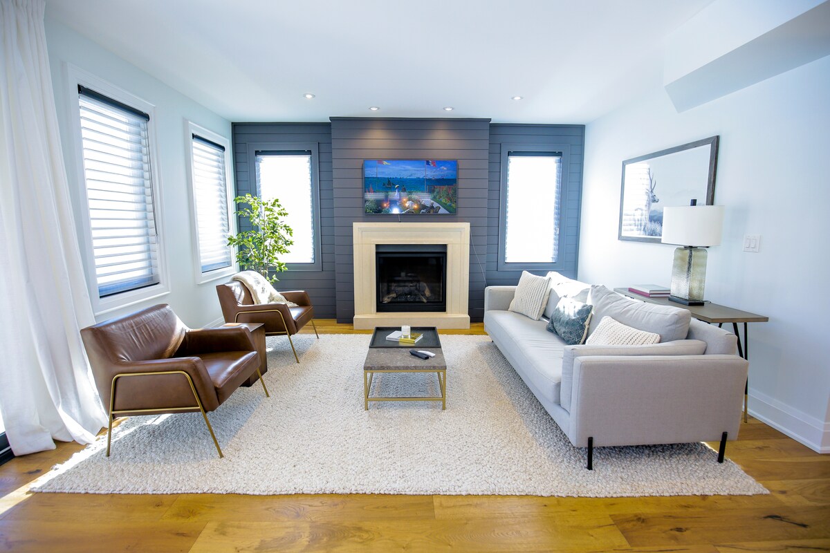 Ubicado en la cima de Horseshoe Valley, este impresionante y único apartamento es el escenario perfecto para un viaje memorable y acogedor. ¡Esta suite lo tiene todo! - Cocina totalmente equipada. - Mesa de comedor para 6 personas. - Sofá cama + sofá de dos plazas + sillón. - Acogedora chimenea. - Cómoda cama tamaño king. - Bañera de inmersión para 2 personas + ducha - Balcón privado. - Piscina interior/exterior abierta todo el año con jacuzzi y sauna. - Gimnasio totalmente equipado. ¡A pocos minutos de Vetta Spa, Horseshoe Valley, campos de golf y mucho más!