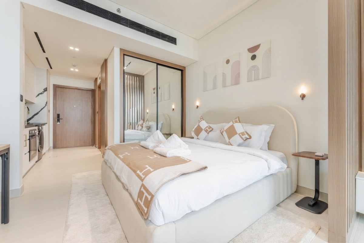 Bienvenido a mi hermoso estudio en el Address Dubai Mall. El espacio: - Vistas ininterrumpidas del Burj Khalifa. - Cama tamaño king con sábanas de primera calidad y un acogedor sillón. - Televisor inteligente de 55 pulgadas. - Cocina totalmente equipada. - Balcón privado. - Baño moderno con toallas y artículos de aseo frescos Acceso para huéspedes: - Piscina con impresionantes vistas al Burj. - Gimnasio con baño de vapor y spa. - Club infantil para divertirse en familia. Ubicación: En el corazón del centro de Dubái, disfrutarás de acceso directo al centro comercial Dubai Mall.