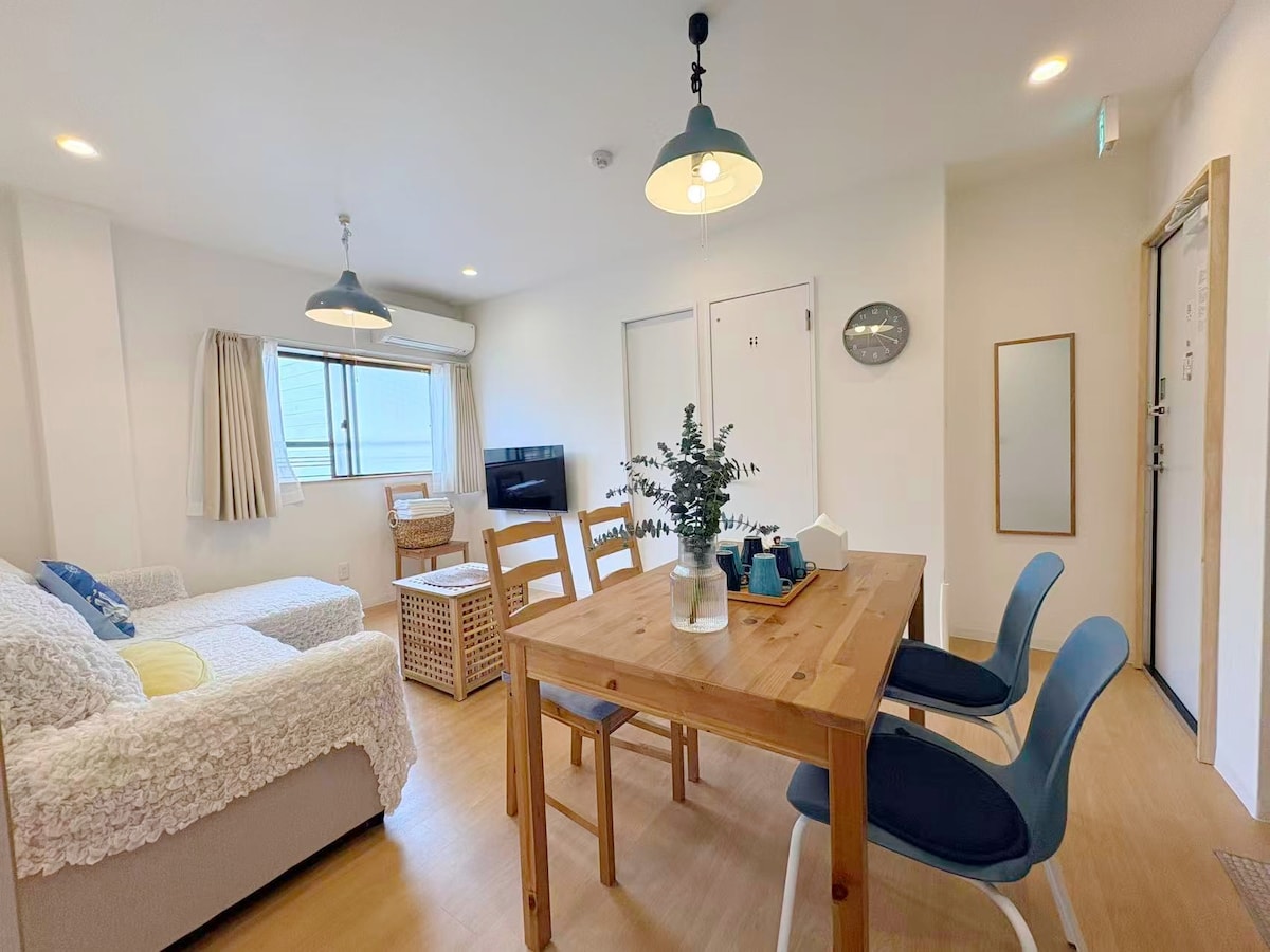 【Japan 8】3楼3号房 【深蓝之梦|治愈海洋风】 🌊 三层整套公寓 房源简介 这是一套位于三层的整套海洋风公寓,整体以深蓝、白色、浅木色与自然编织元素为主调,空间明亮整洁,氛围安静轻松。 从墙面色彩到软装细节,都带着自然柔和的海洋气息,不是刻意堆砌装饰,而是一种让人住进去会觉得清爽、放松、适合休息的感觉。 房源面积约65平方米,为两室一厅整套独享。 室内设有两间独立卧室、客餐厅一体的公共空间、简洁实用的厨房、独立卫浴以及阳台,整体布局清晰自然,适合短住,也适合连续入住。 其中一间卧室配有1张双人床; 另一间卧室配有1张双人床 + 1张单人床,床位安排灵活,适合家庭成员或朋友同行。 房源最多可入住5位客人,更推荐4位客人舒适入住,让睡眠、活动与日常起居都更轻松。 公共区域采用客厅、餐厅与厨房相连的布局,空间自然舒展。无论是早上简单吃早餐,还是晚上回房后休息、聊天、整理行李,都会更有“住下来”的舒适感。 房内带有独立阳台,采光很好,白天自然光进入室内后,整个空间会更显通透清爽,也让连续入住更舒服。 这是一套既有主题感、又适合旅行居住的房子,让人真正放松下来