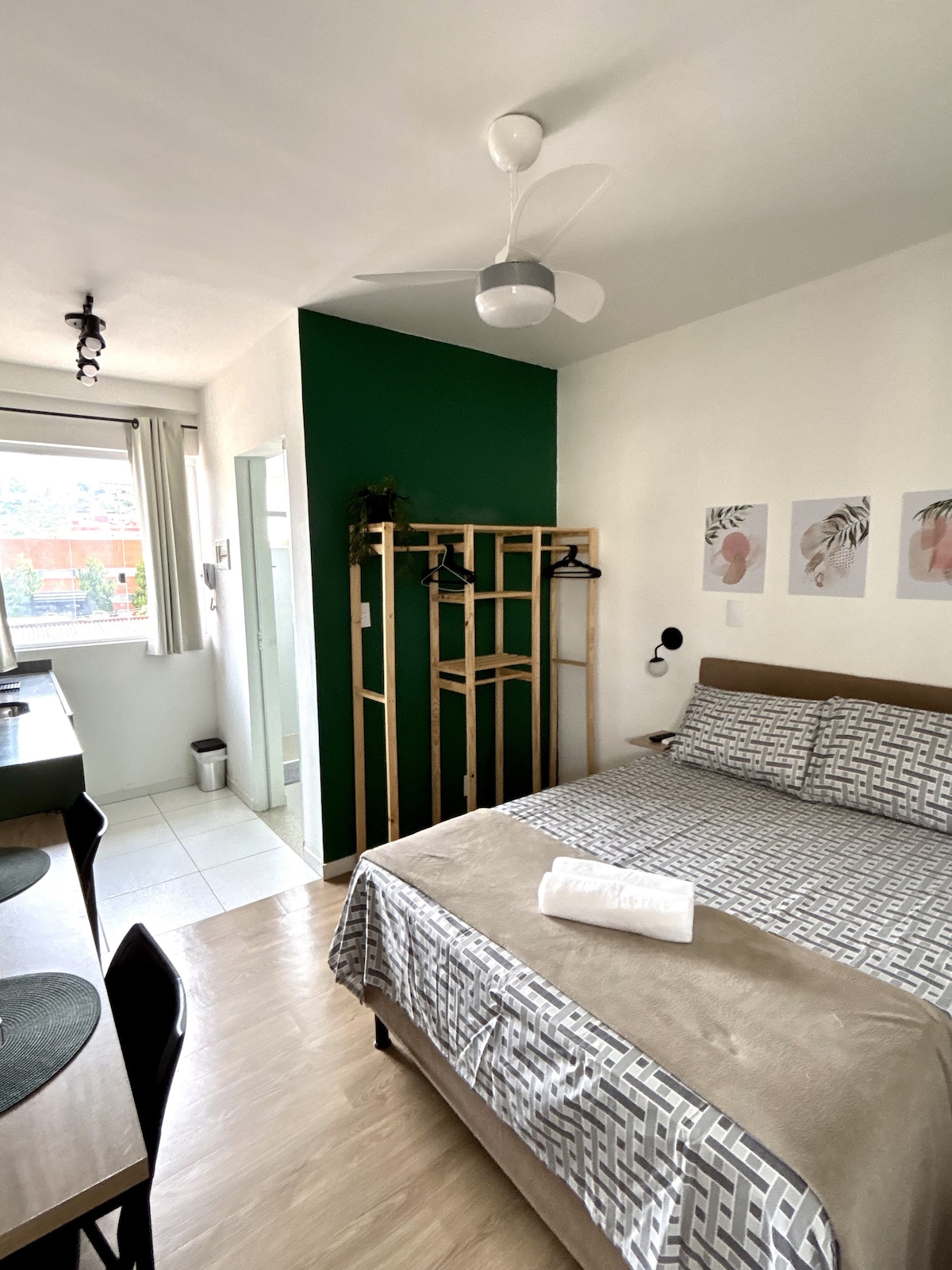 Espaço super aconchegante e funcional no centro de Belo Horizonte. Projetado com um design moderno e acolhimento que apenas um lar mineiro oferece! 🏠 Ambiente integrado com: ➤ Cama Queen Size com lençóis 300 fios, sofá-cama amplo confortável. ➤ Ar-condicionado, cortina blackout total, escrivaninha espaçosa. ➤ Banheiro com secador de cabelo, cozinha prática e completa, máquina de lavar. ➤ Fechadura eletrônica na porta, televisão, Wi-Fi.