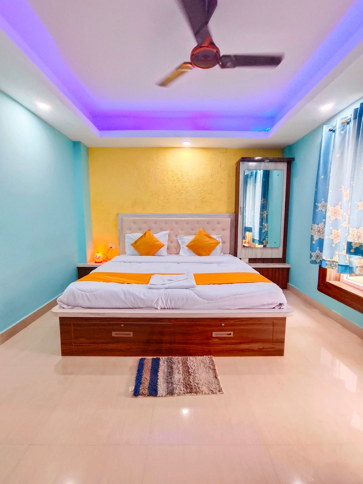 Fully furnished spacious 1-bedroom (530 sq ft) located at Laxmi Nivas, Chakratirtha road, Puri. Centrally located : 1min walk to the beach & 10 mins ride to Shree Jagannath Temple. Room on 1st floor - no lift Perfect for couples,friends or a family of 3. Kitchen(breakfast, tea, reheating food),Wi-fi,AC,1 full sized bed & single bed, geyser, balcony,dining table. Power backup available. Parking - subject to availability.Need to inform beforehand. Bike/Car rentals available nea